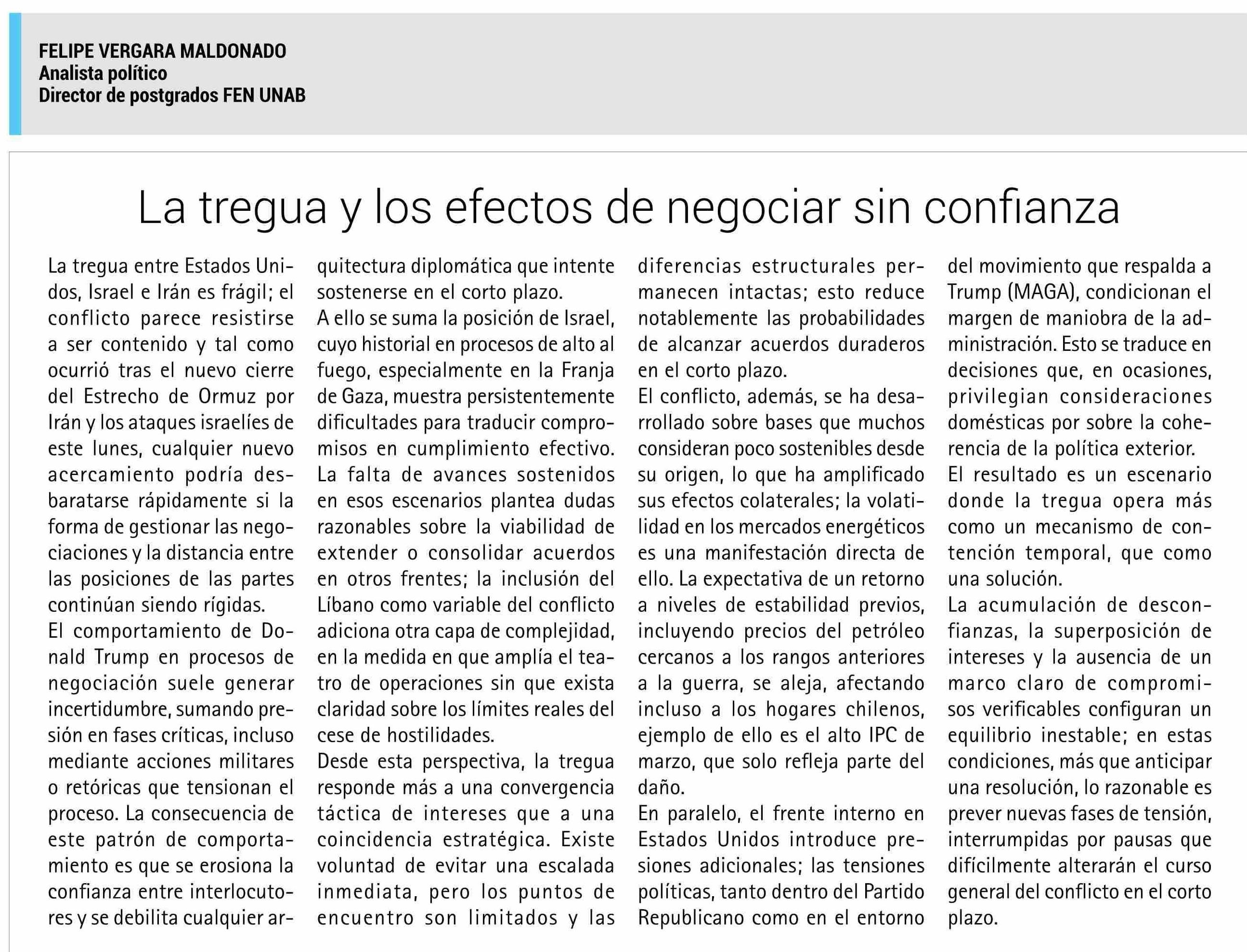 COLUMNAS DE OPINIÓN: La tregua y los efectos de negociar sin confianza 10-04-2026 El Rancagüino |
