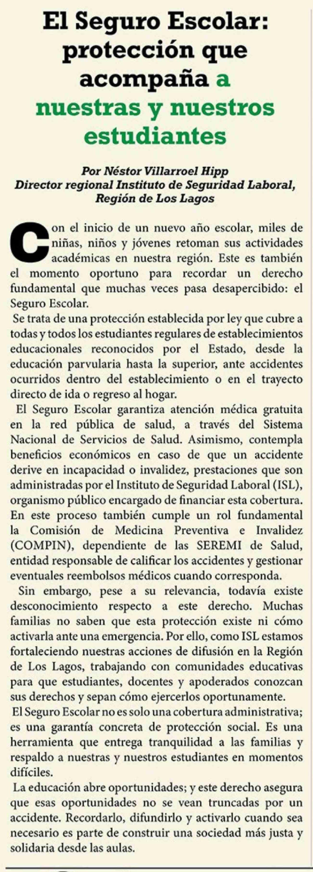 Columnas de Opinión: El Seguro Escolar: protección que acompaña a nuestras y nuestros estudiantes 27-02-2026 El Heraldo Austral |