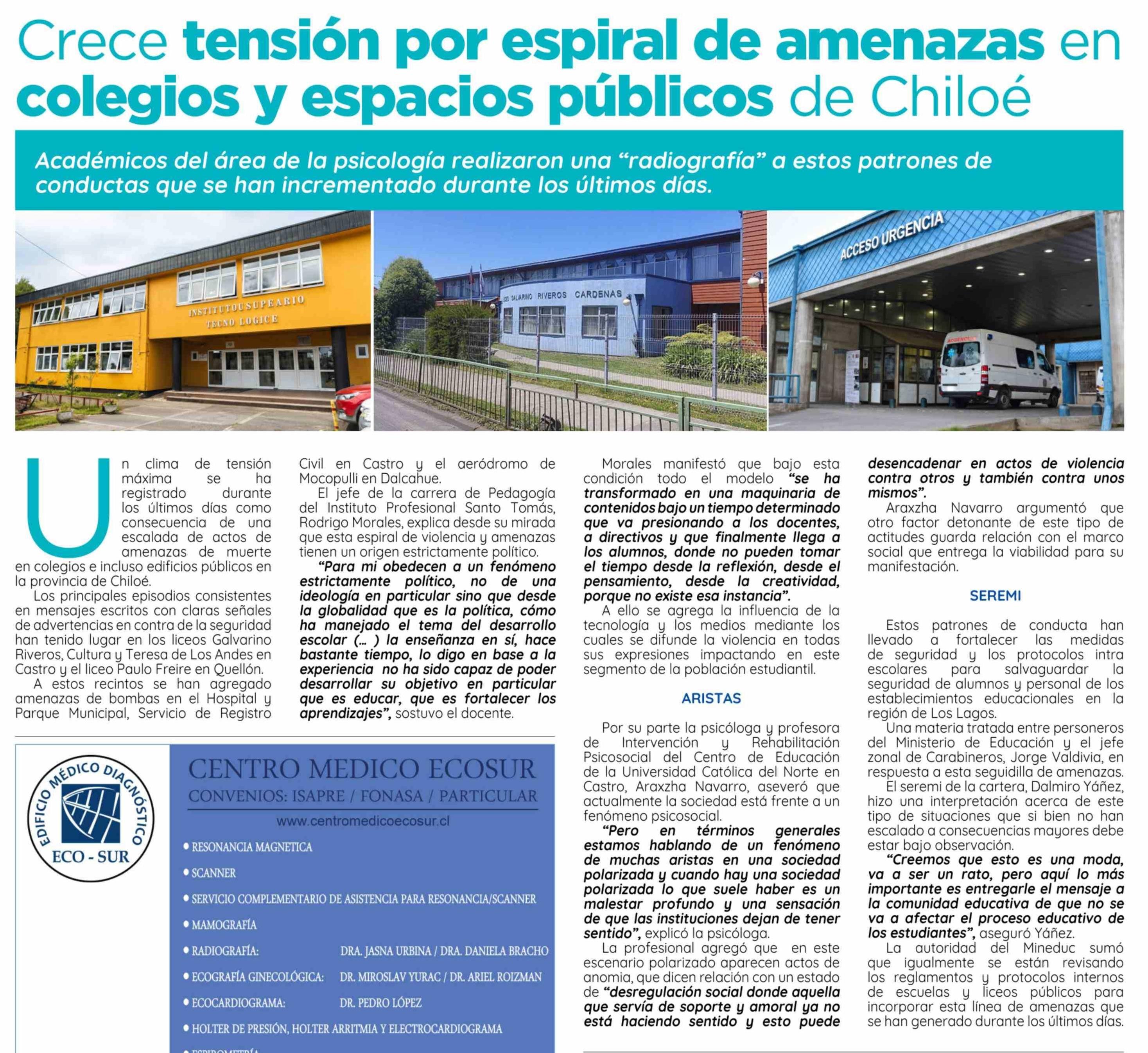 | Título: | Crece tensión por espiral de amenazas en colegios y espacios públicos de Chiloé |