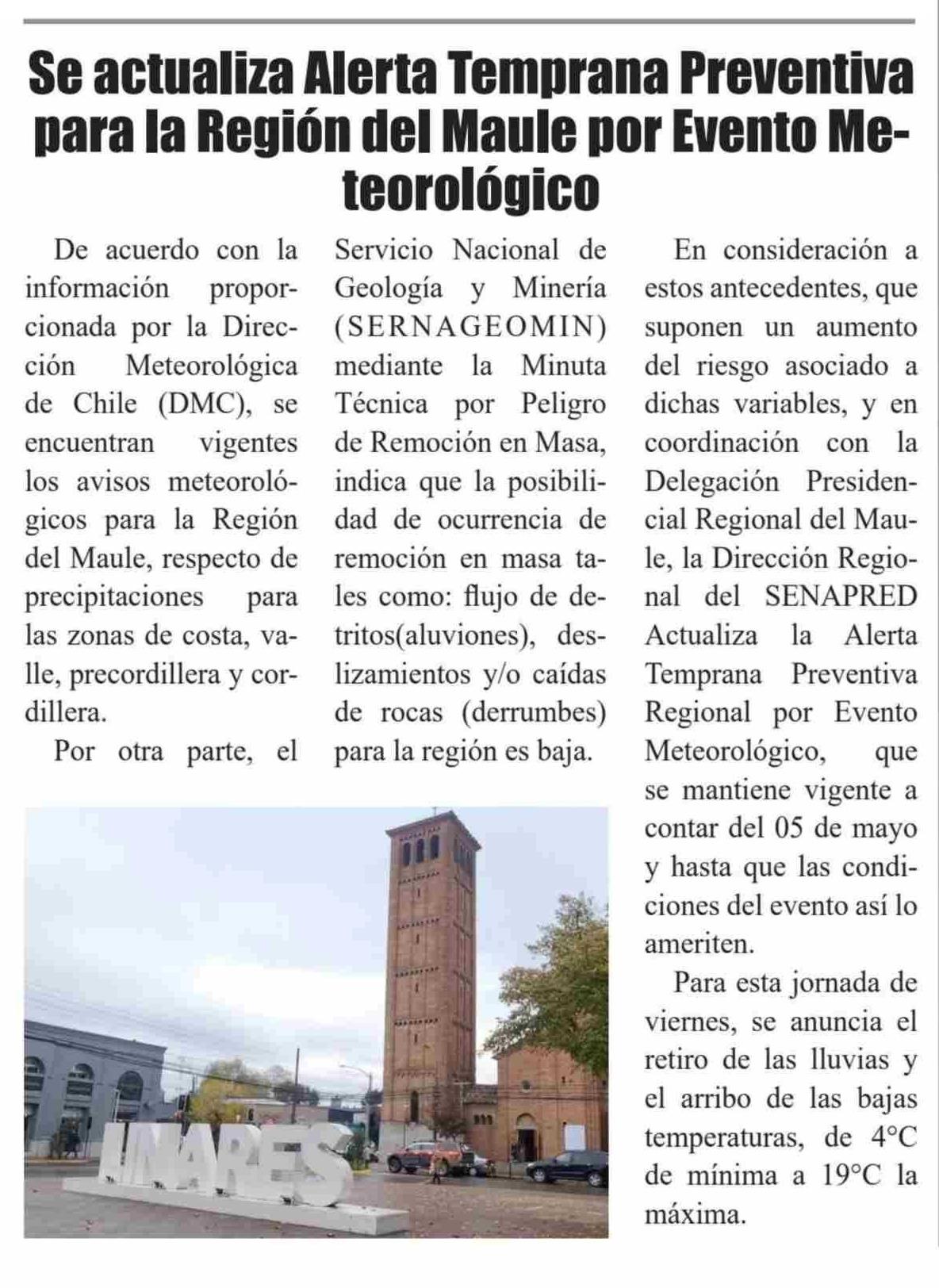 Se actualiza Alerta Temprana Preventiva para la Región del Maule por Evento Meteorológico 09-05-2025 El Heraldo |