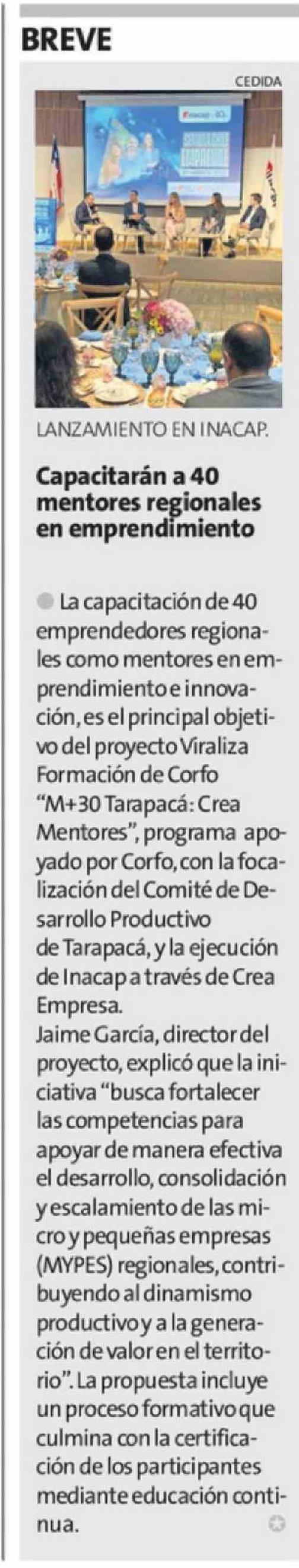 Capacitarán a 40 mentores regionales en emprendimiento 24-04-2026 La Estrella de Iquique |