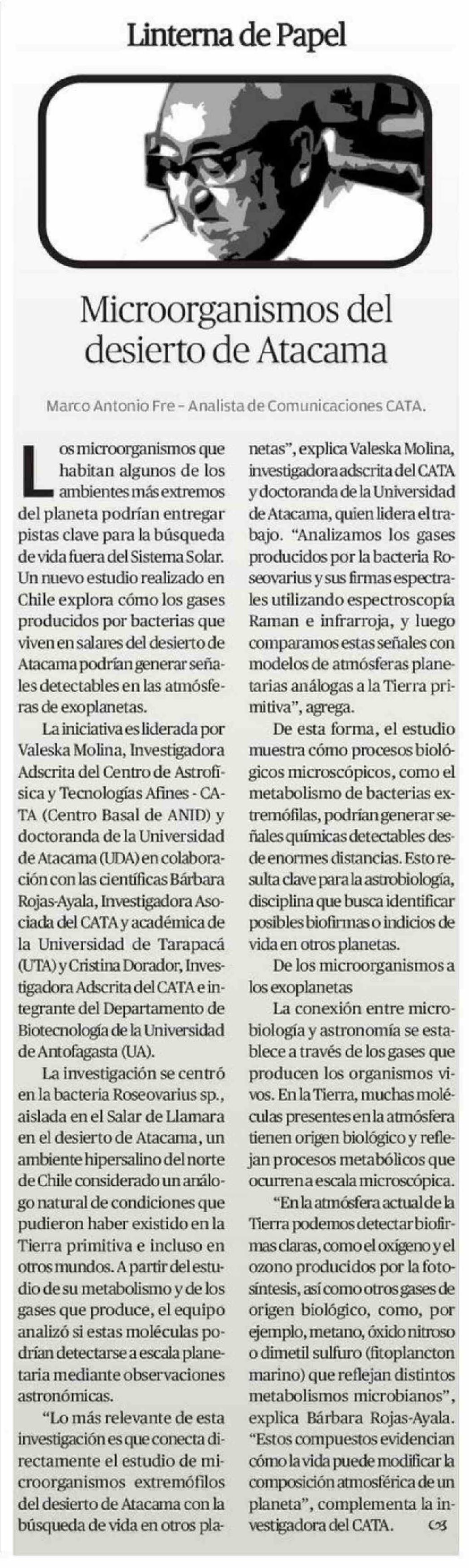 Columnas de Opinión: Microorganismos del desierto de Atacama 20-04-2026 El Mercurio de Antofagasta |