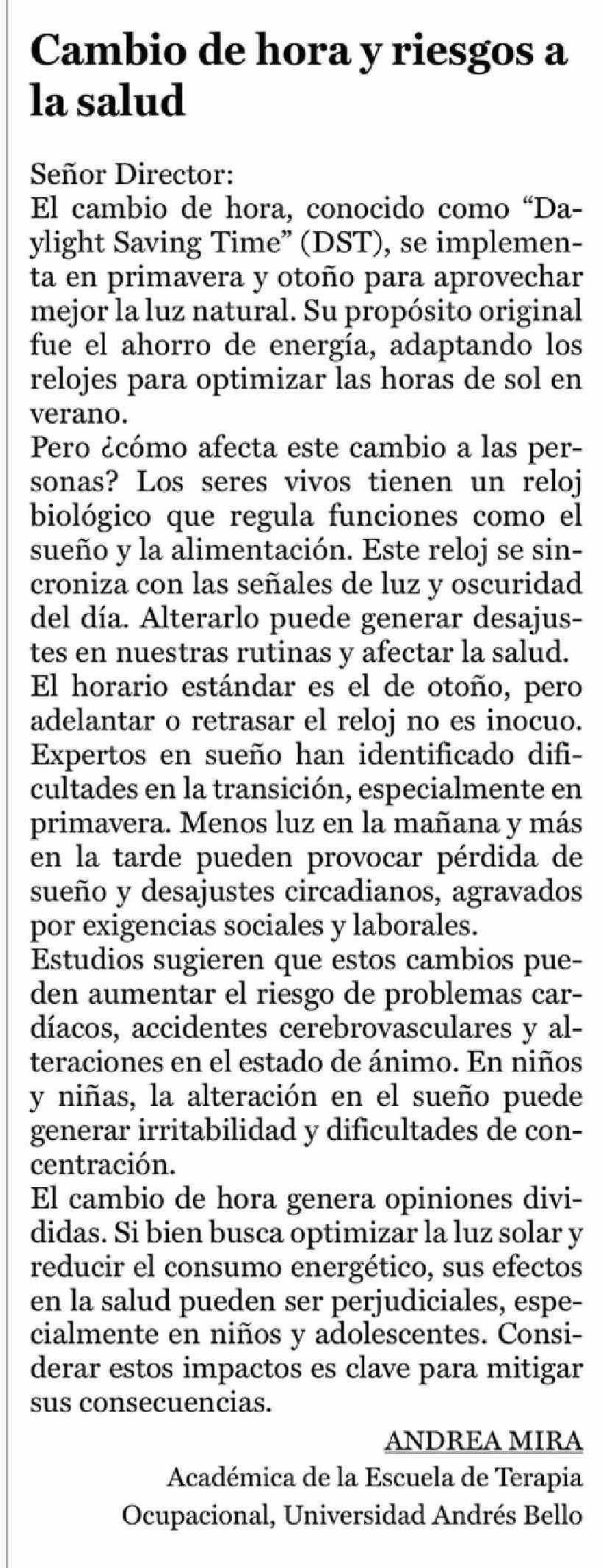 | Título: | Cartas: Cambio de hora y riesgos a la salud |