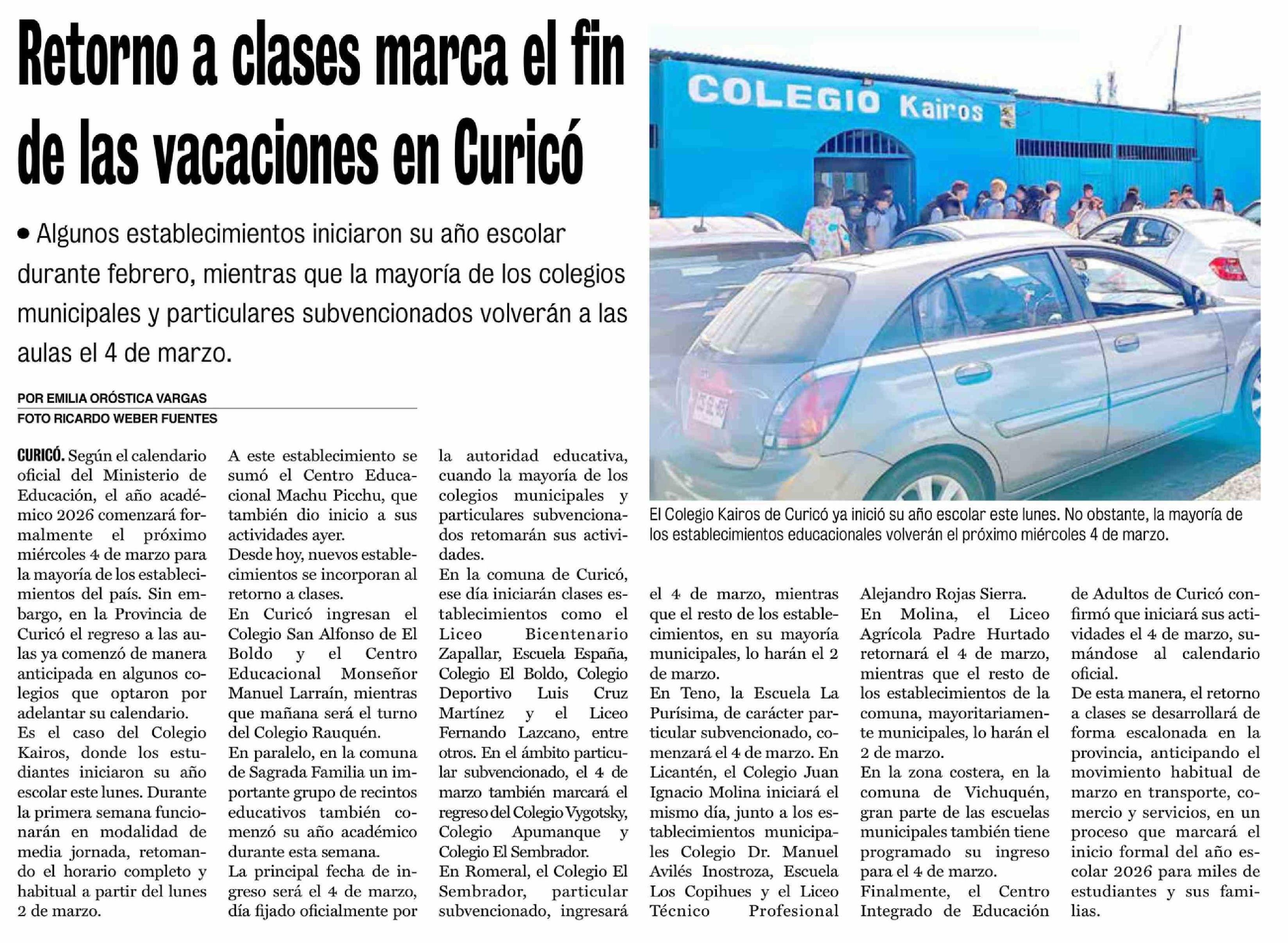 Retorno a clases marca el fin de las vacaciones en Curicó 25-02-2026 La Prensa de Curicó |