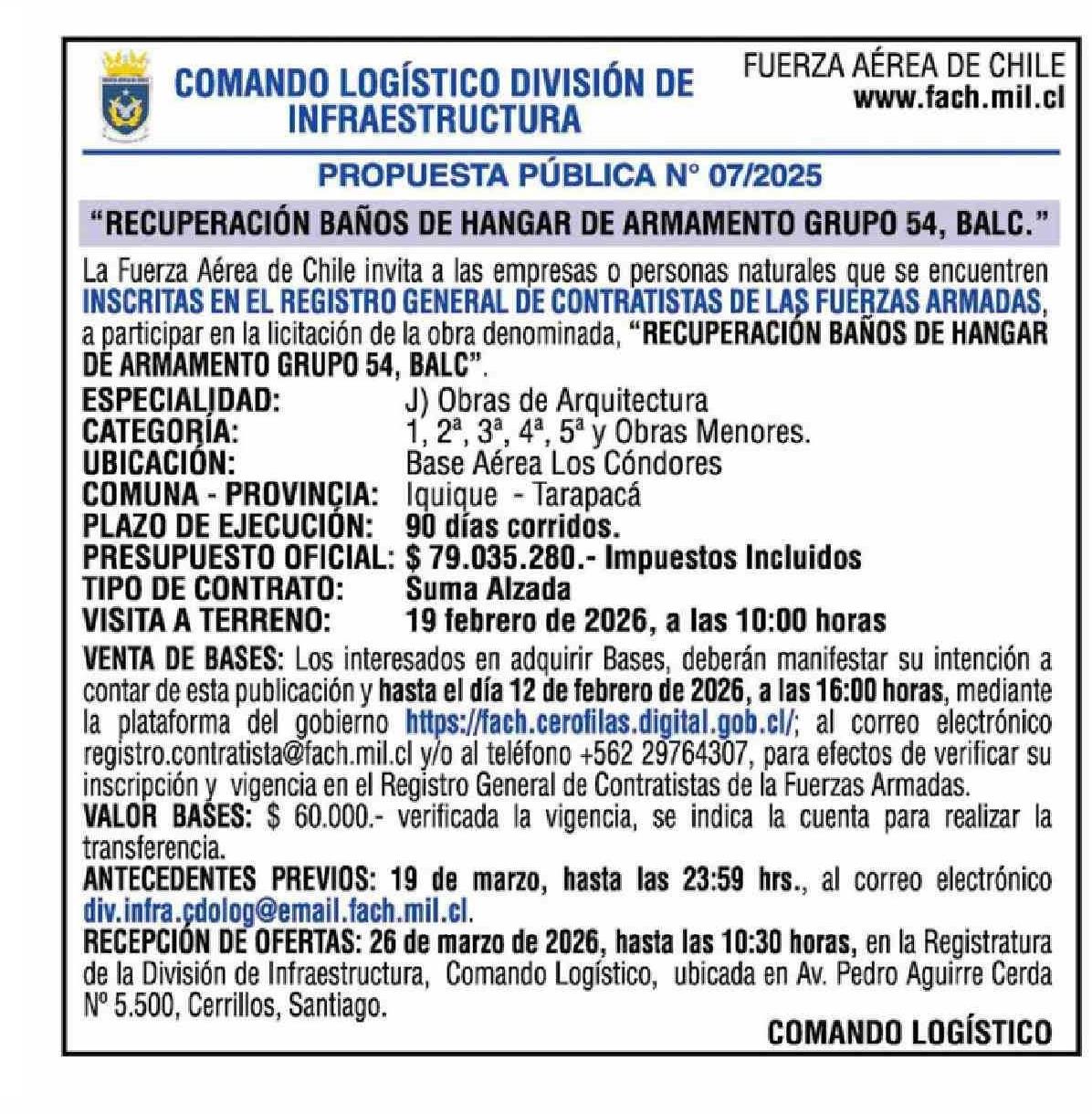 Título: AVISO LICITACIONES: FUERZA AÉREA DE CHILE