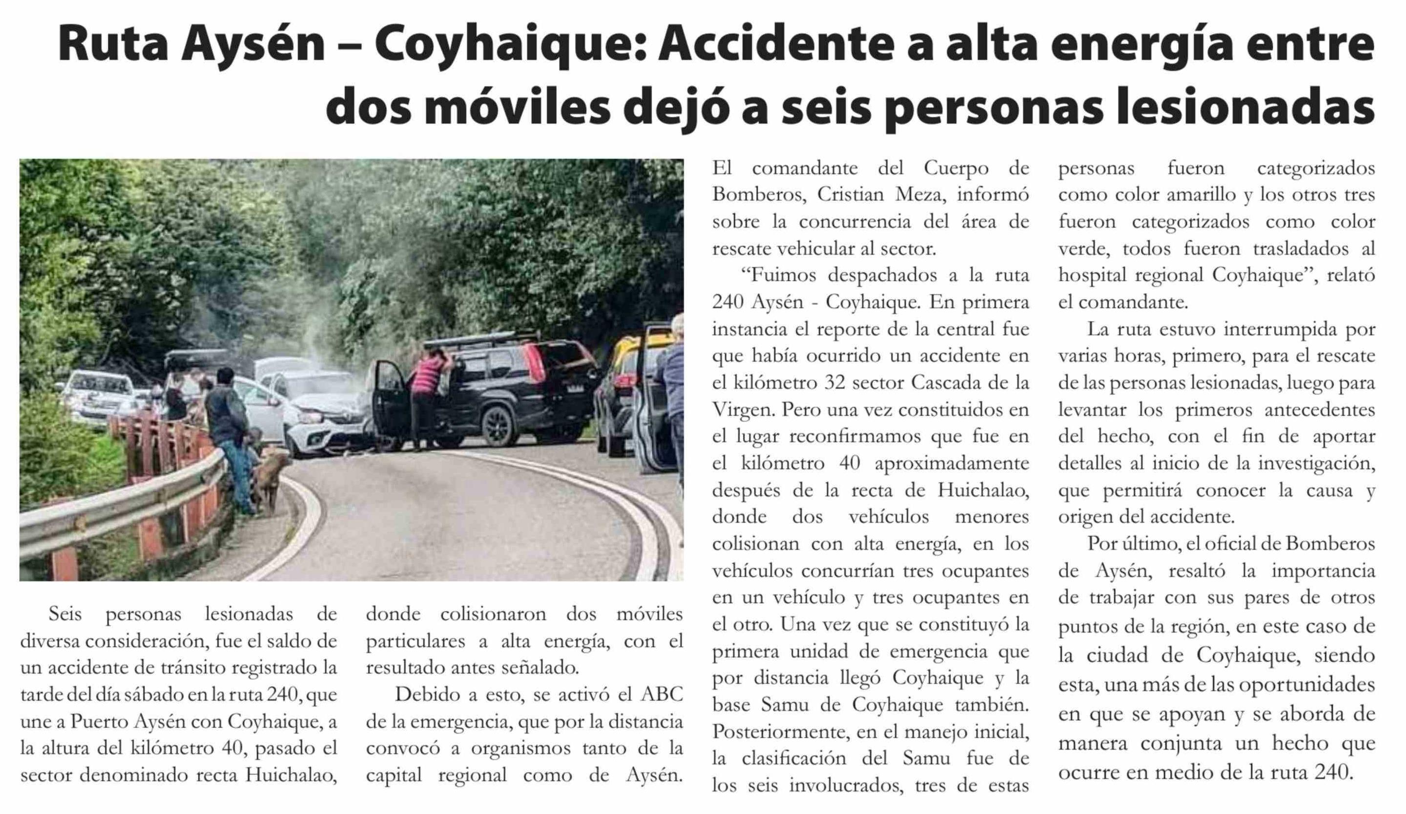 Título: Ruta Aysén - Coyhaique: Accidente a alta energía entre dos móviles dejó a seis personas lesionadas
