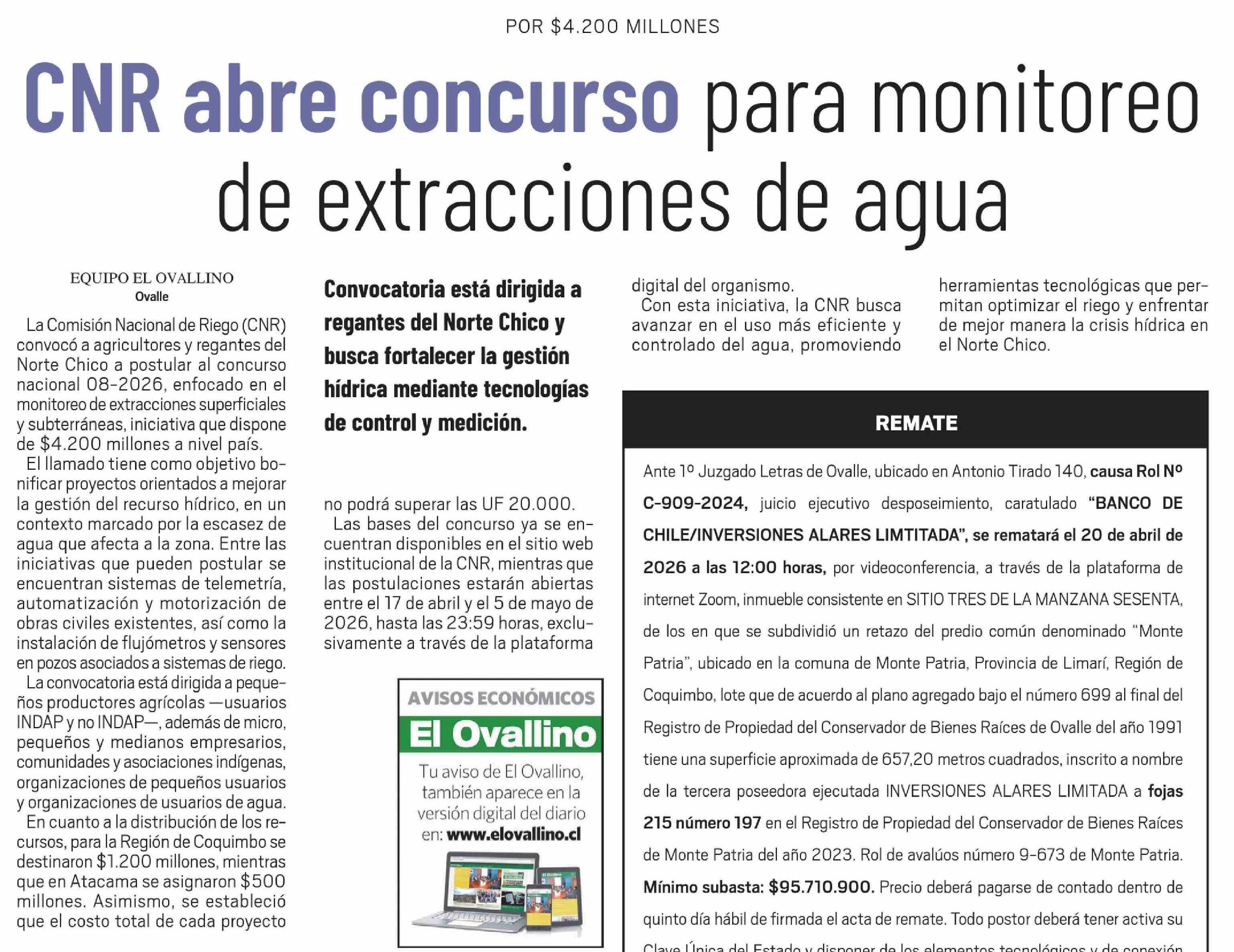CNR abre concurso para monitoreo de extracciones de agua 05-04-2026 El Ovallino |