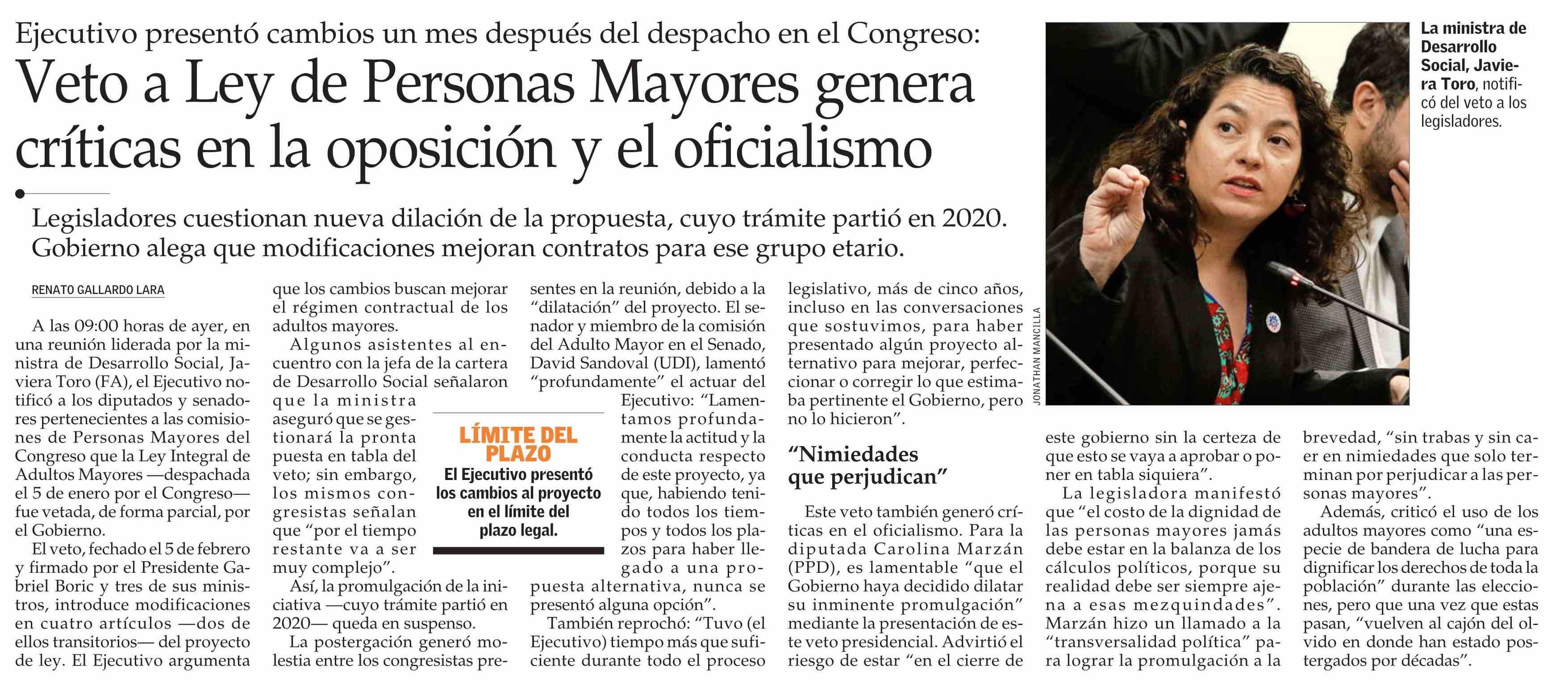 Veto a Ley de Personas Mayores genera críticas en la oposición y el oficialismo 28-02-2026 El Mercurio |