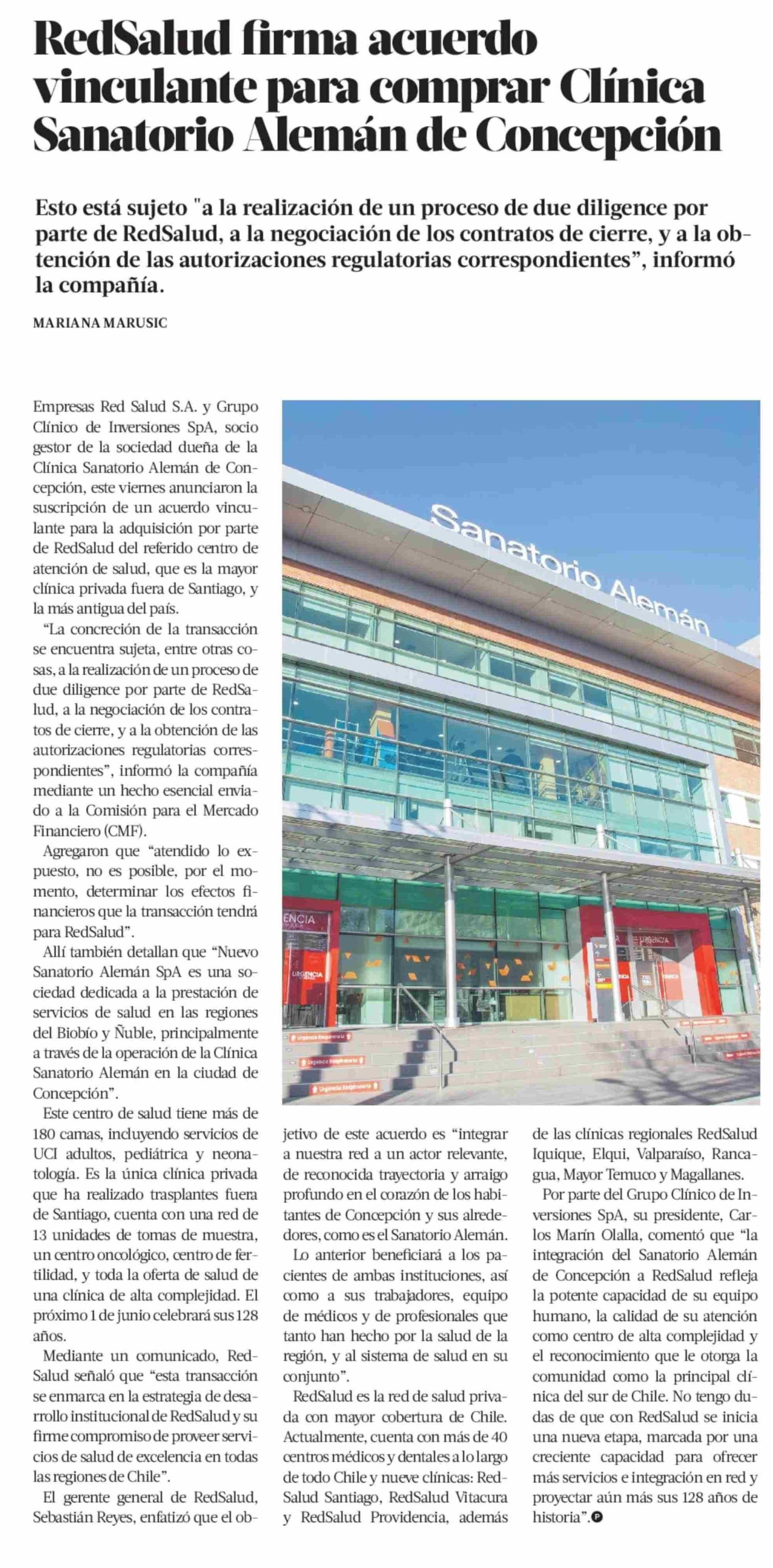 | Título: | RedSalud firma acuerdo vinculante para comprar Clínica Sanatorio Alemán de Concepción |