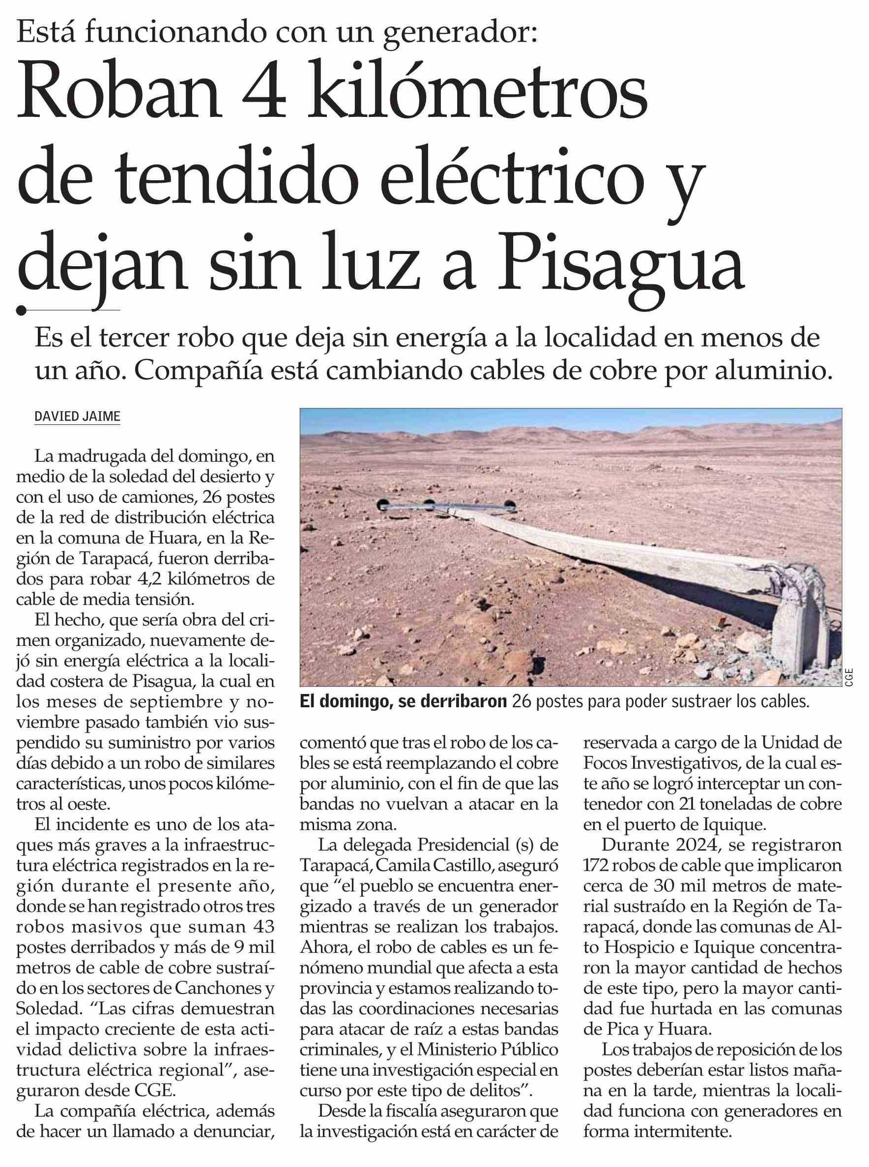 Roban 4 kilómetros de tendido eléctrico y dejan sin luz a Pisagua 17-06-2025 El Mercurio |