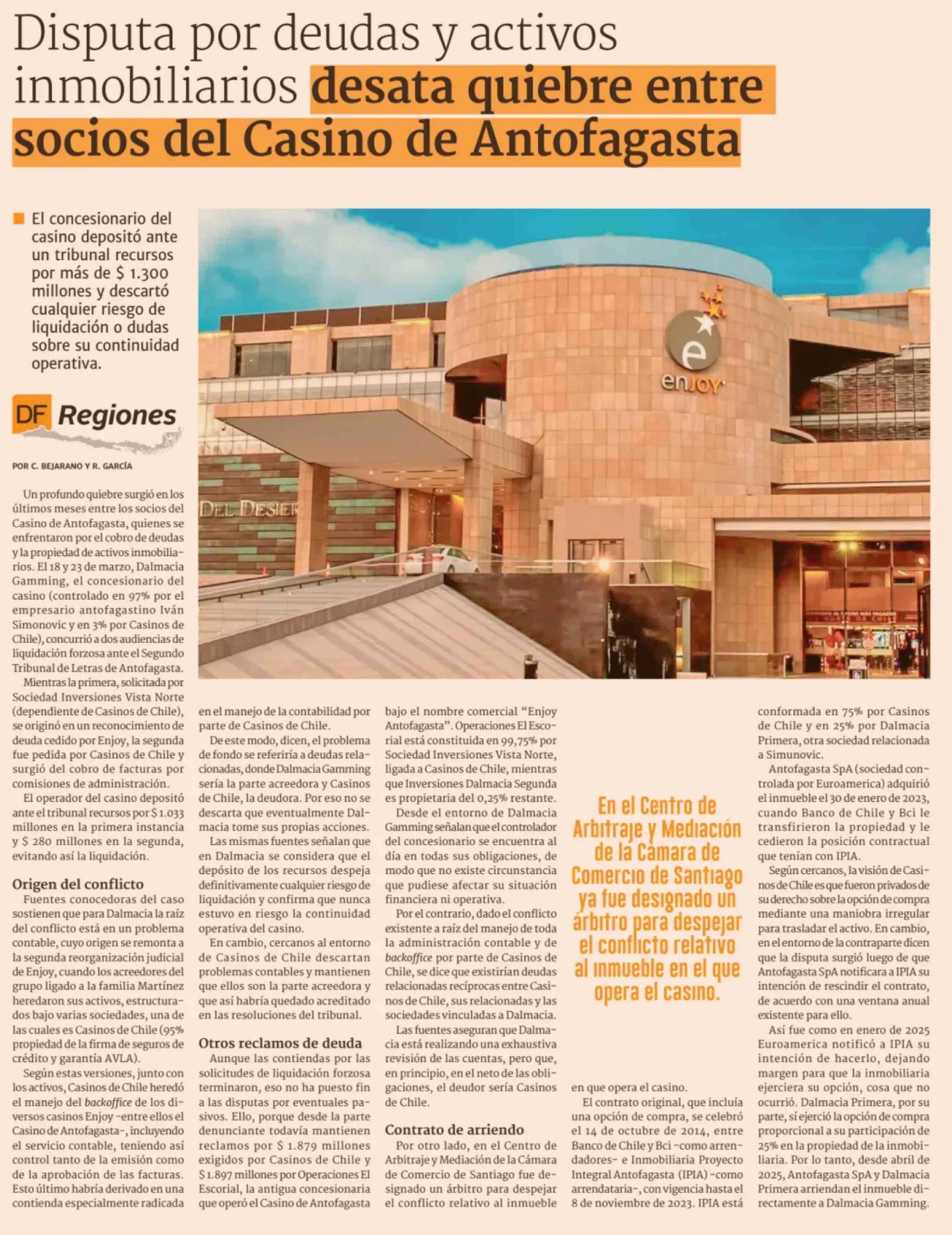 Disputa por deudas y activos inmobiliarios desata quiebre entre socios del Casino de Antofagasta 08-04-2026 Diario Financiero |