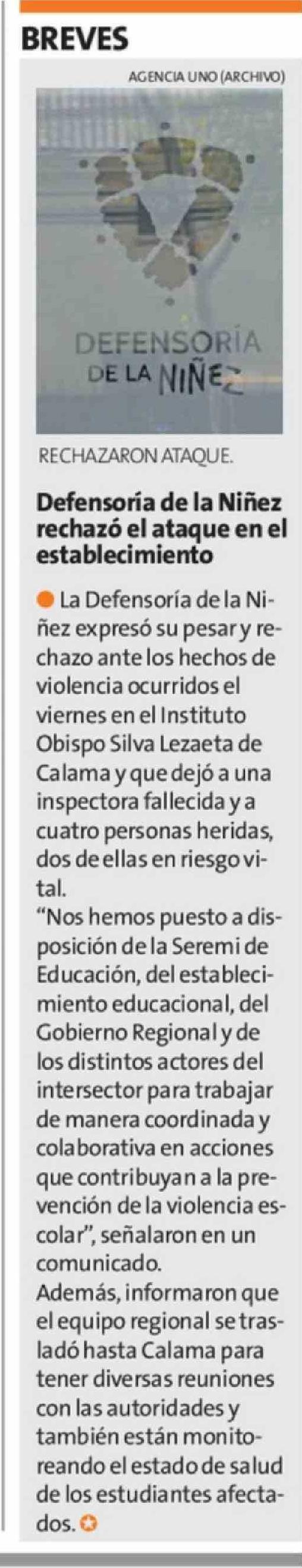 Título: Defensoría de la Niñez rechazó el ataque en el establecimiento