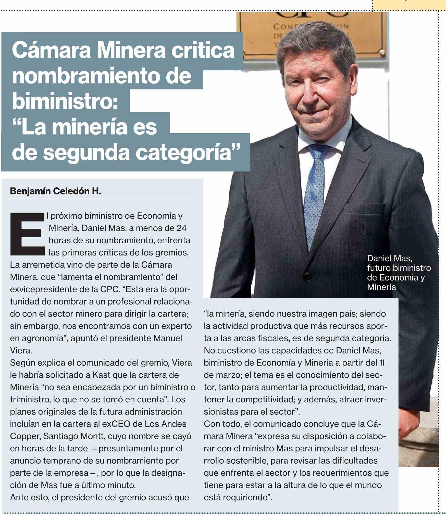 Cámara Minera critica nombramiento de biministro: "La minería es de segunda categoría" 21-01-2026 La Segunda |