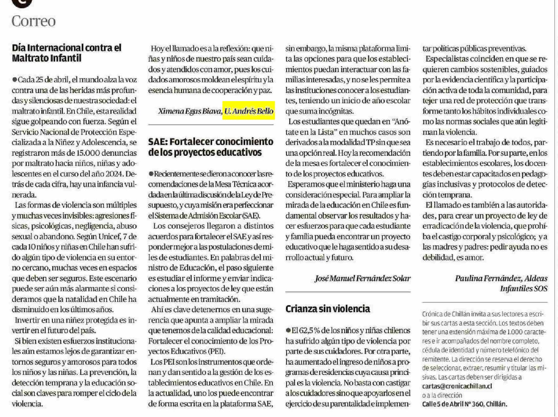 Día Internacional contra el Maltrato Infantil 9Cada25 de abril, el mundoalzala voz contra una delas heridas más profundasysilenciosas de nuestrasociedad: el 27-04-2025 Crónica de Chillán |