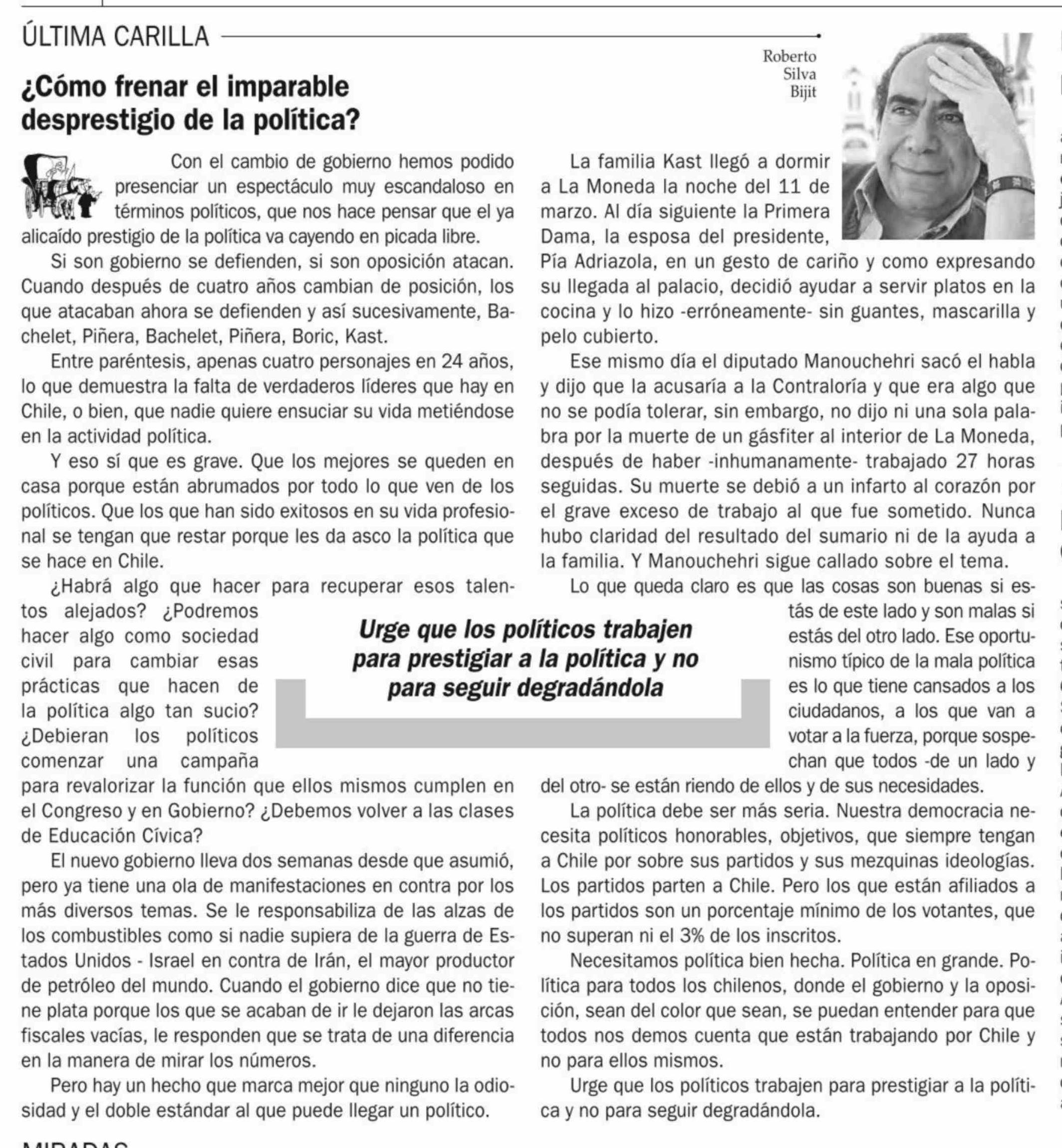 Editorial: ¿Cómo frenar el imparable desprestigio de la política? 27-03-2026 El Observador |