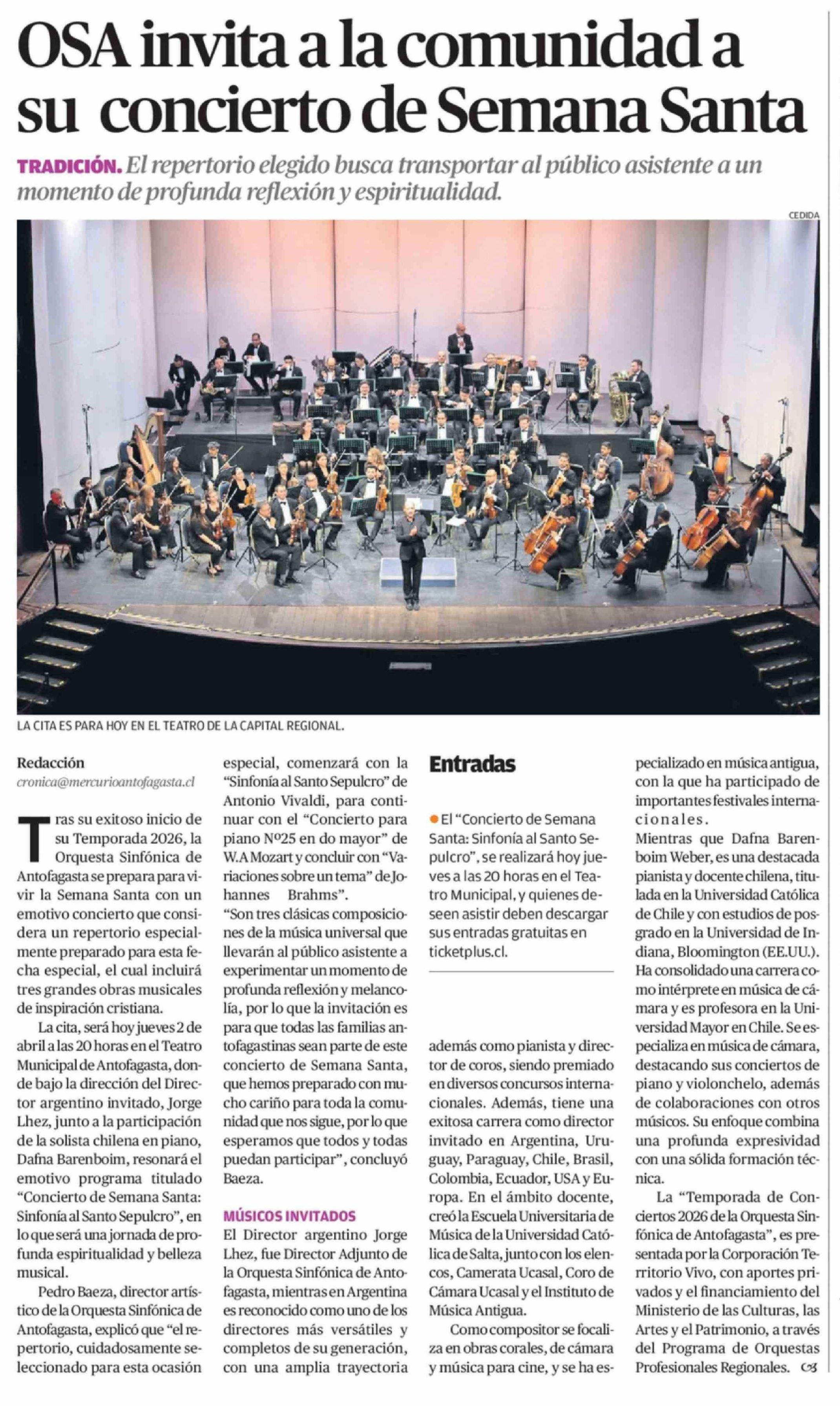 Título: OSA invita a la comunidad a su concierto de Semana Santa