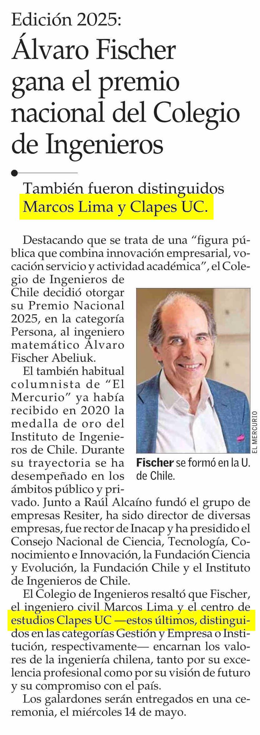 Álvaro Fischer gana el premio nacional del Colegio de Ingenieros 07-05-2025 El Mercurio |