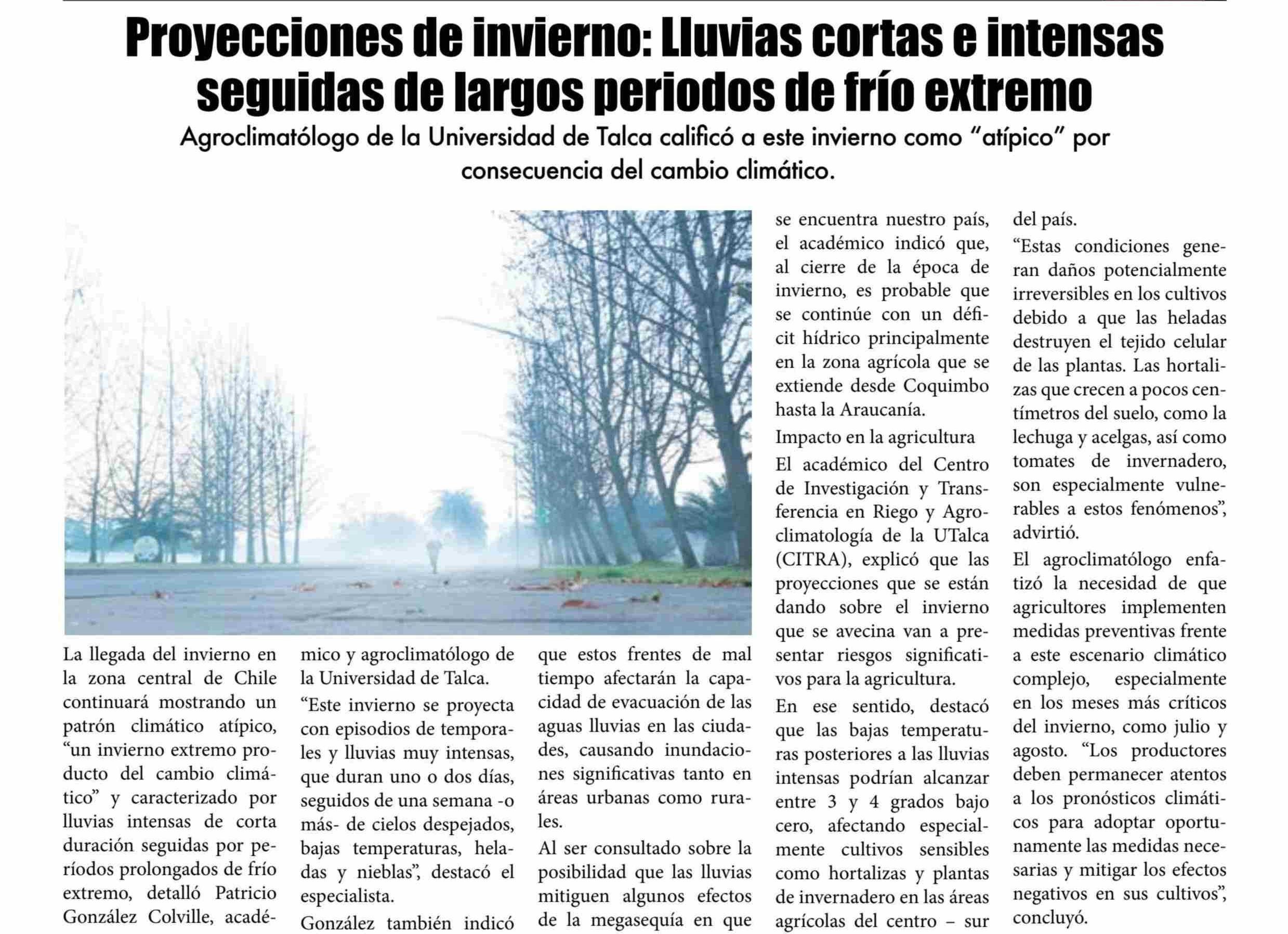 | Título: | Proyecciones de invierno: Lluvias cortas e intensas seguidas de largos periodos de frío extremo |