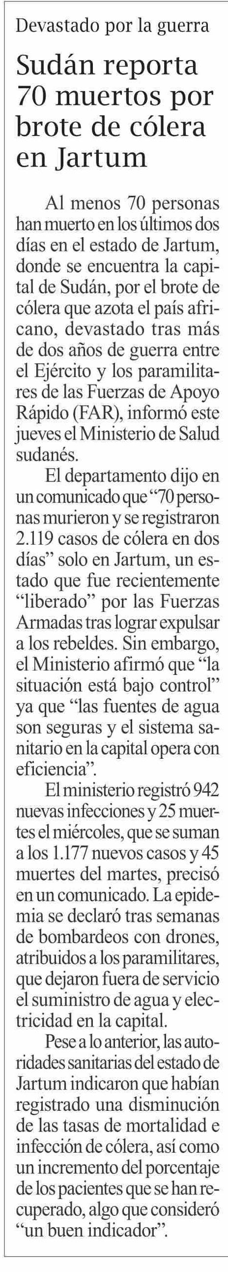 | Título: | Sudán reporta 70 muertos por brote de cólera en Jartum |