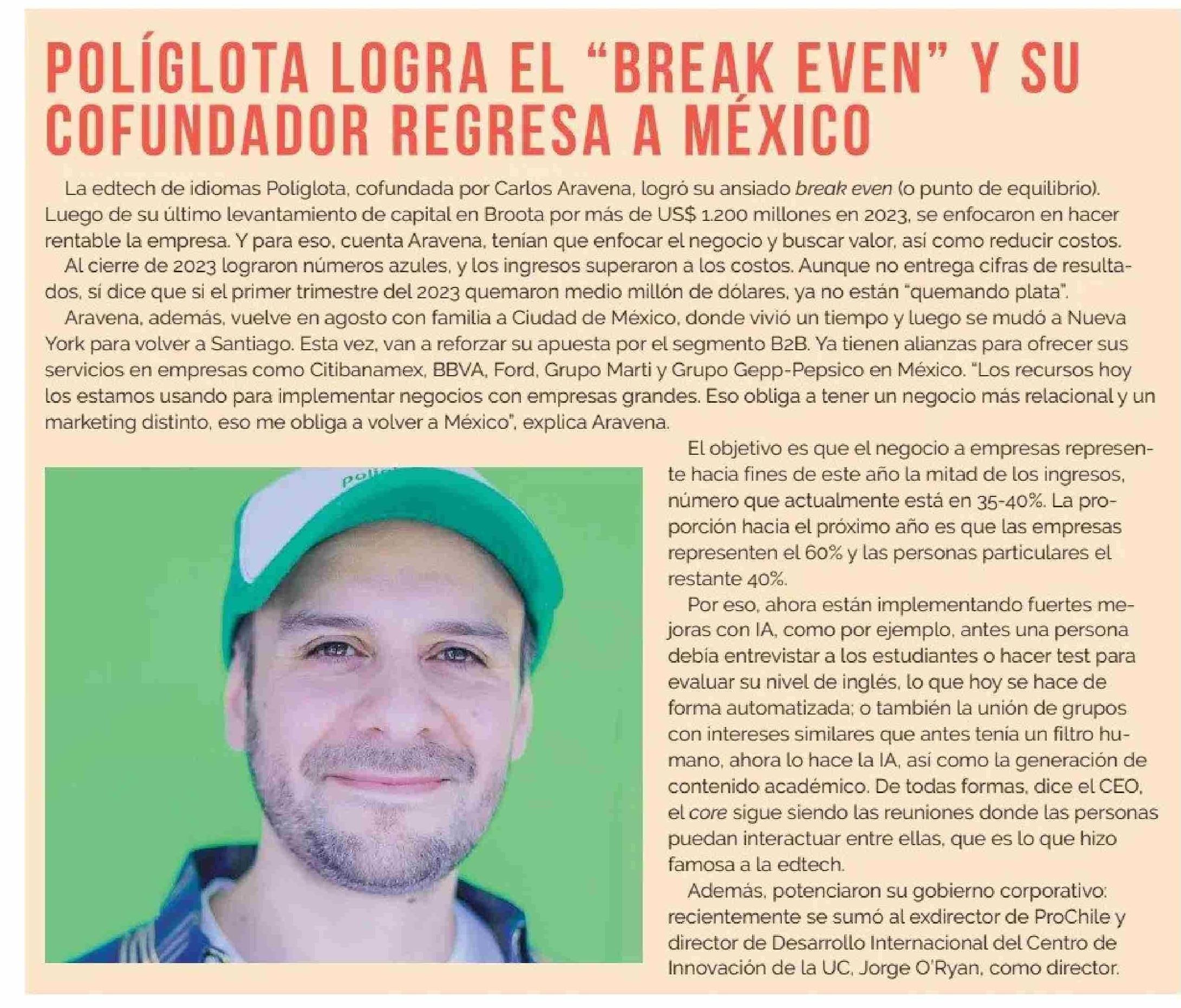 POLIGLOTA LOGRA EL “BREAK EVEN” Y SU COFUNDADOR REGRESA A MÉXICO 21-07-2024 Diario Financiero |