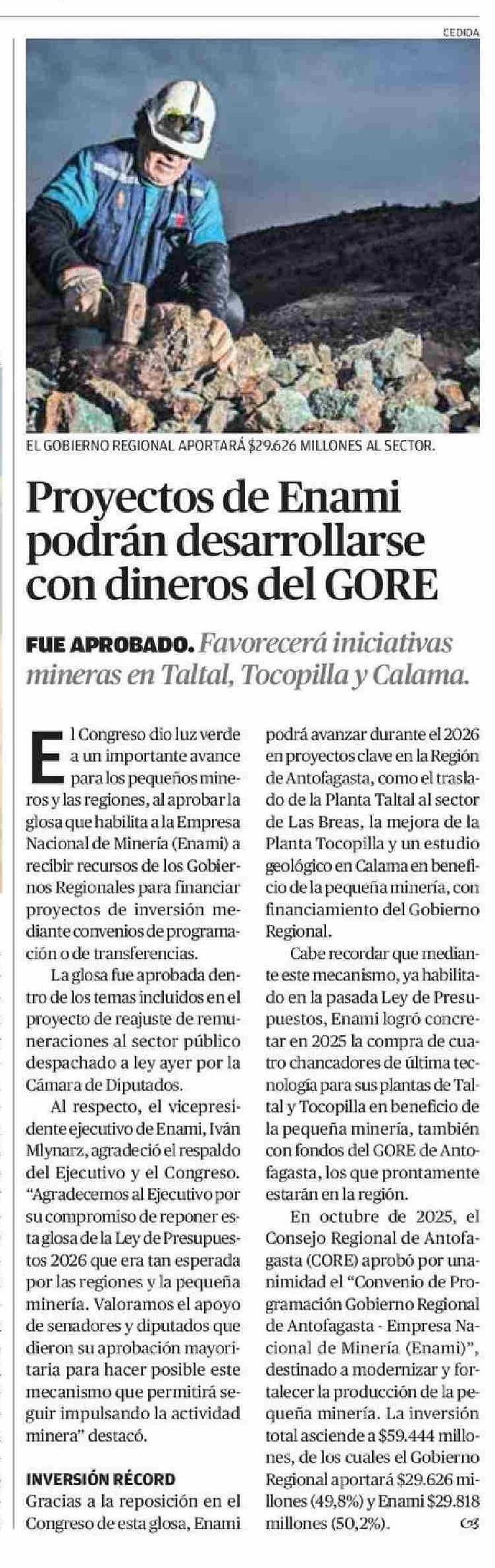 Título: Proyectos de Enami podrán desarrollarse con dineros del GORE