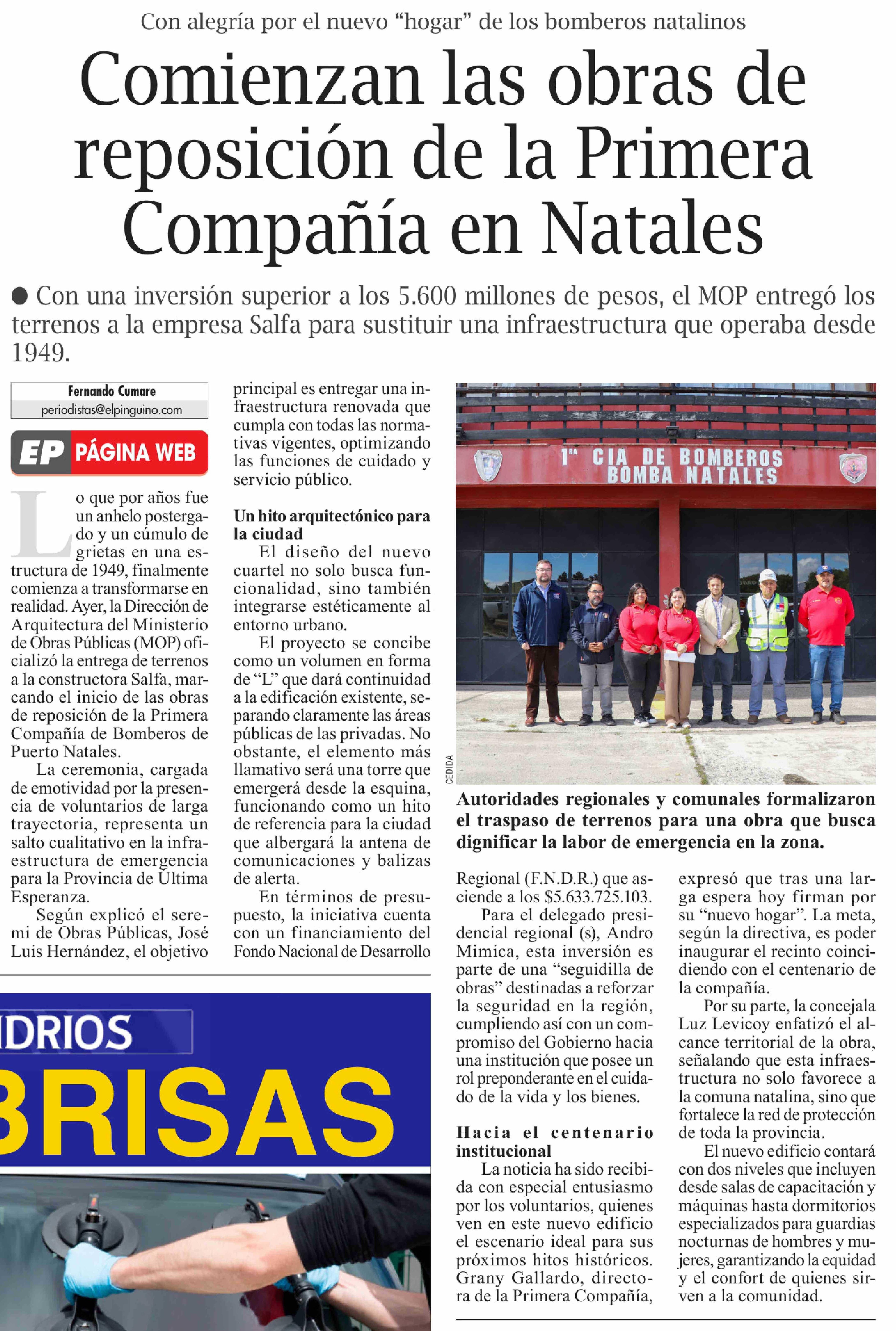 Título: Comienzan las obras de reposición de la Primera Compañía en Natales
