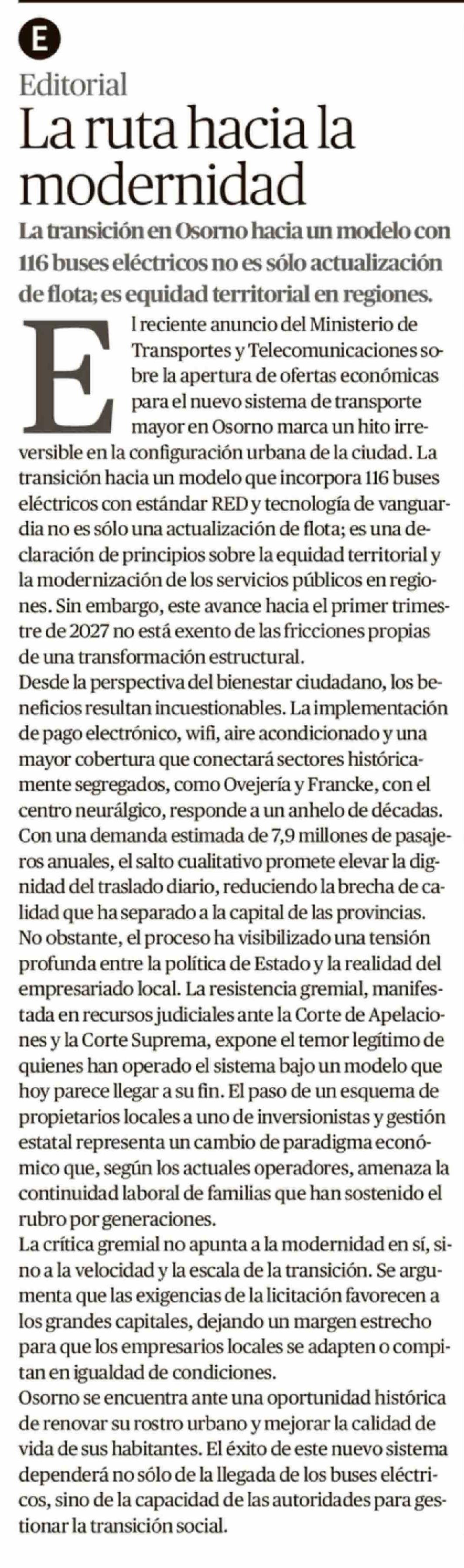 Editorial: La ruta hacia la modernidad 10-02-2026 El Austral de Osorno |