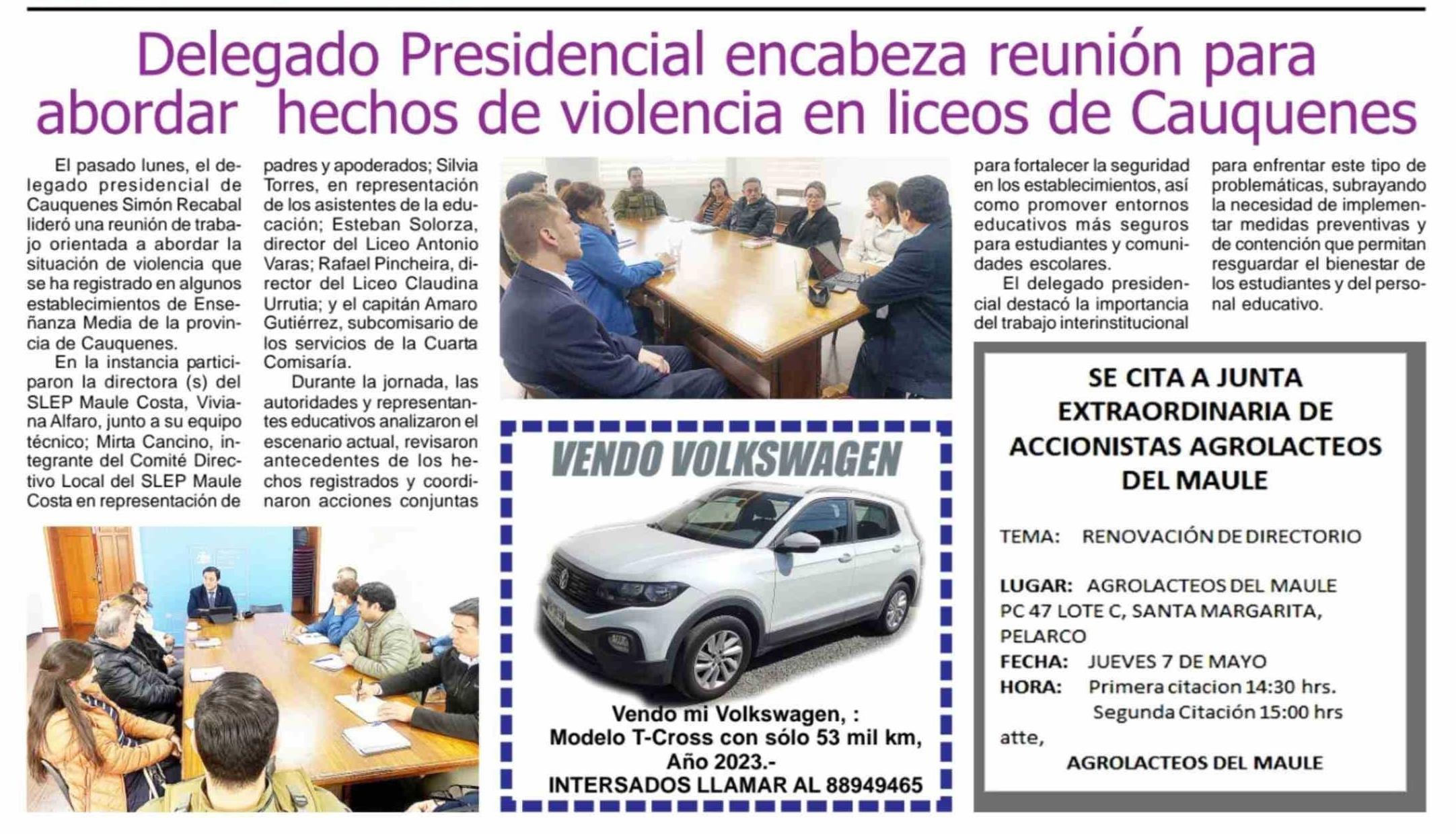 Delegado Presidencial encabeza reunión para abordar hechos de violencia en liceos de Cauquenes 22-04-2026 Maule Hoy |
