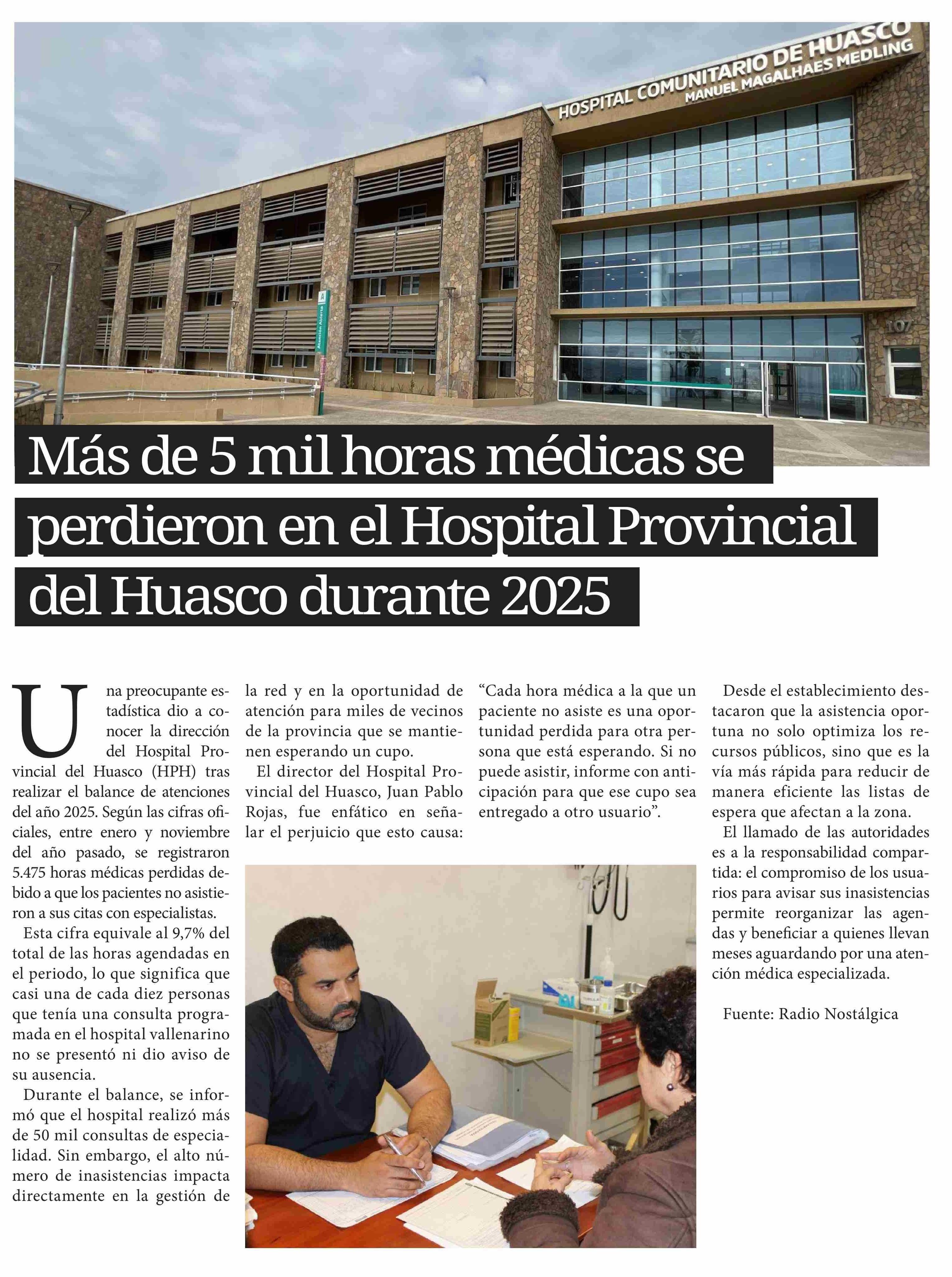 Más de 5 mil horas médicas se perdieron en el Hospital Provincial del Huasco durante 2025 26-01-2026 Diario Chañarcillo |