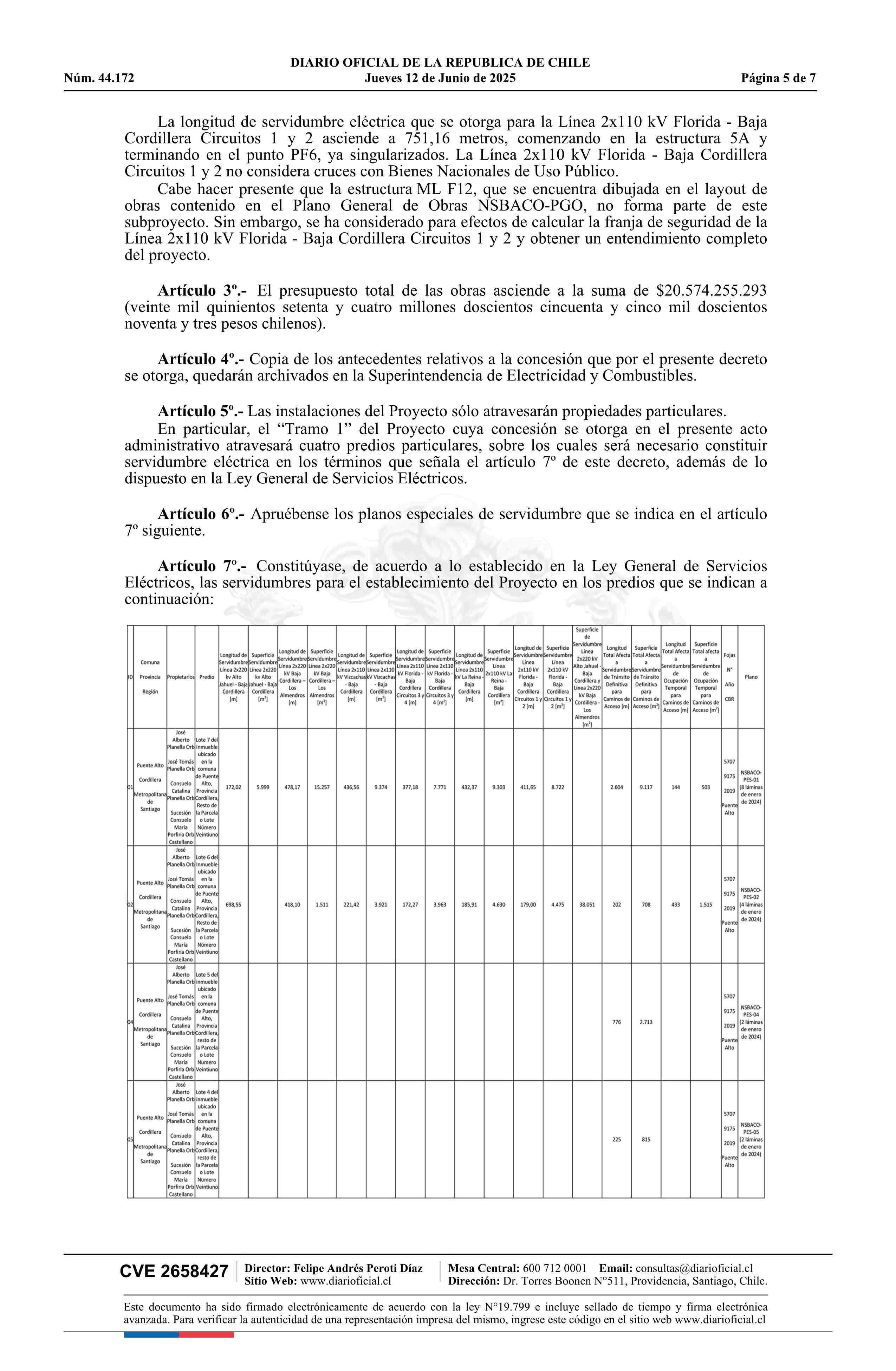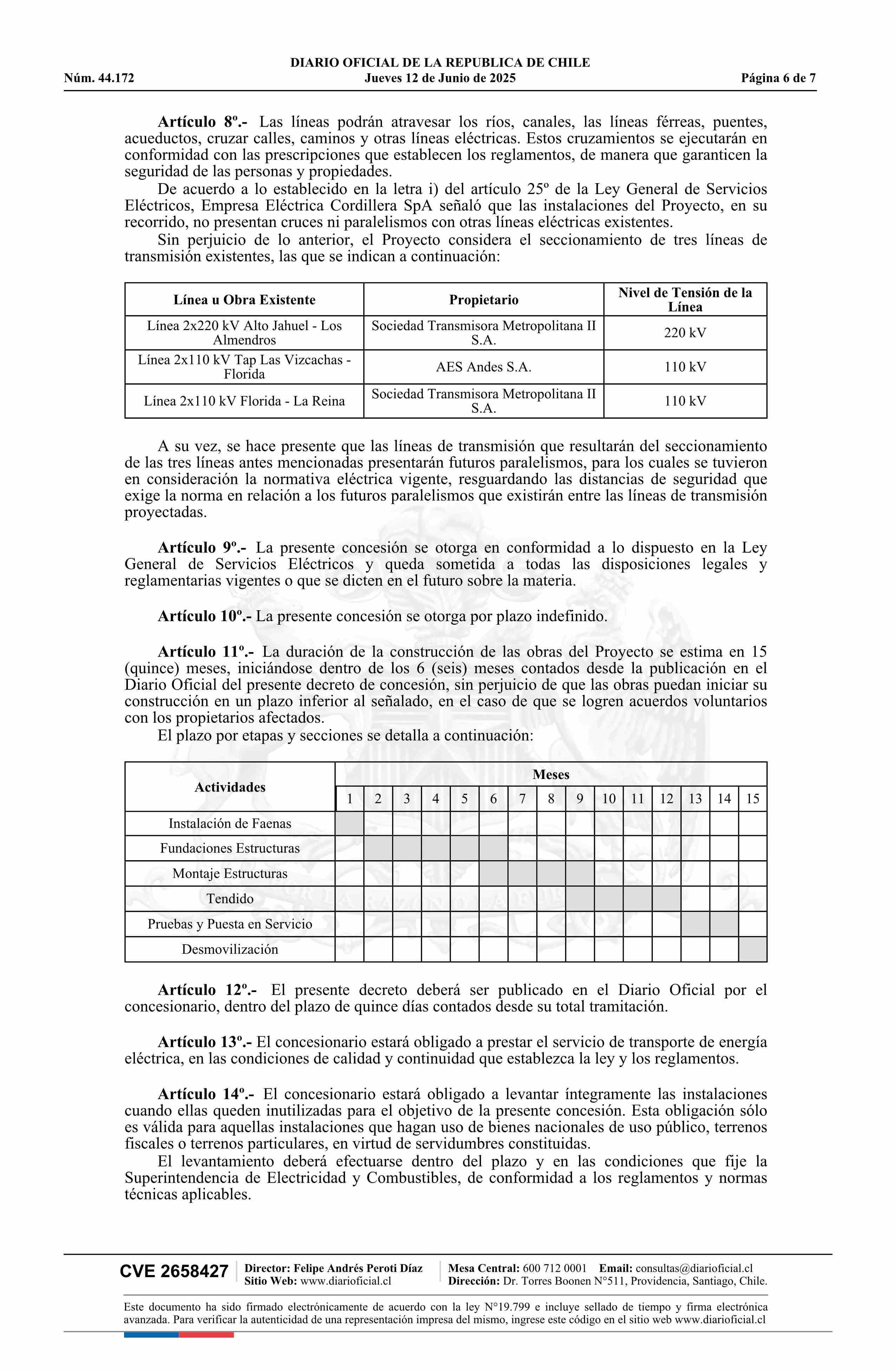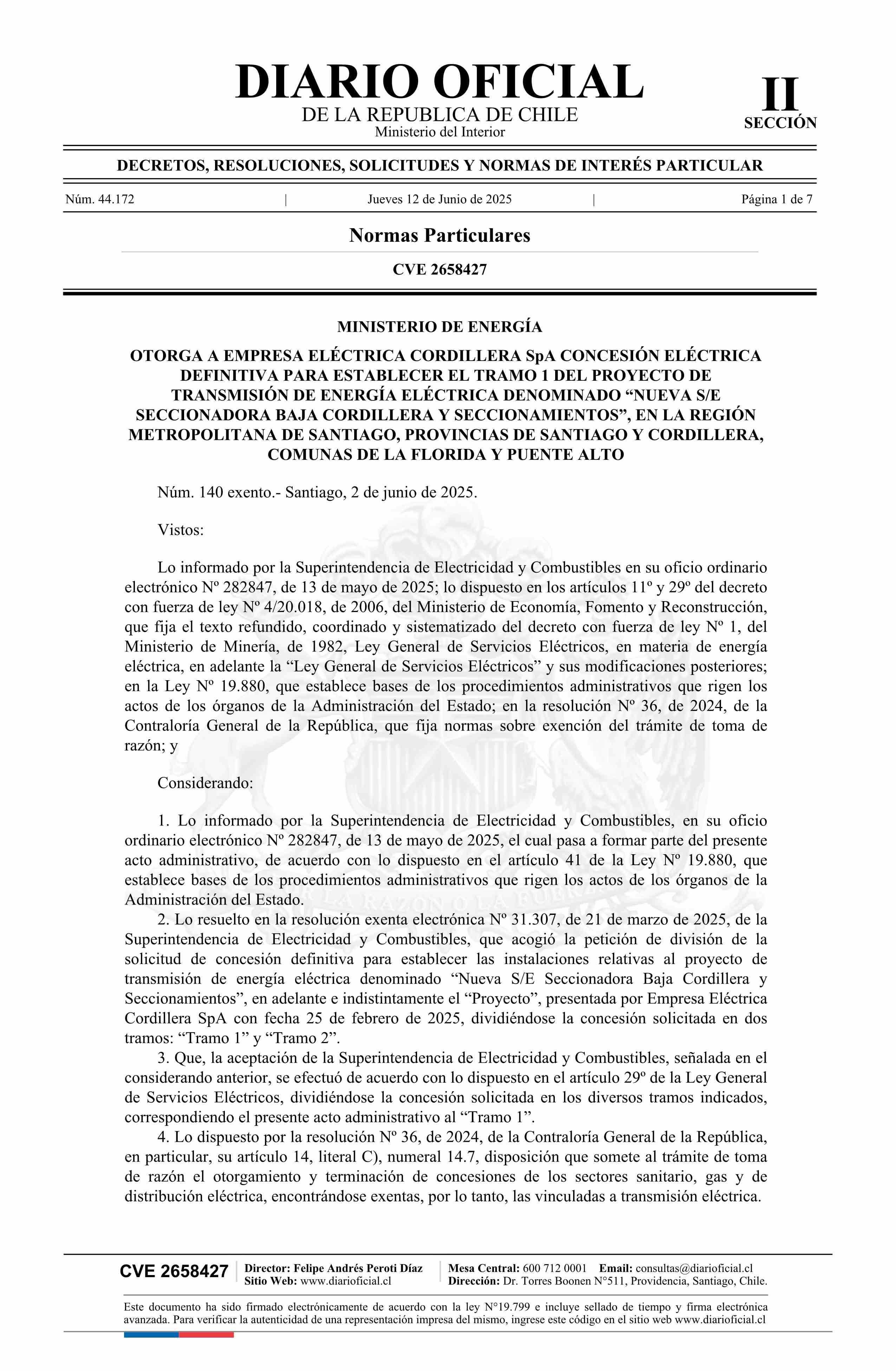 | Título: | Decreto exento número 140, de 2025.- Otorga a Empresa Eléctrica Cordillera SpA concesión eléctrica definitiva para establecer el Tramo 1 del proyecto de transmisión de energía eléctrica denominado Nueva S/E Seccionadora Baja Cordillera y Seccionamientos, en la Región Metropolitana de Santiago, provi |