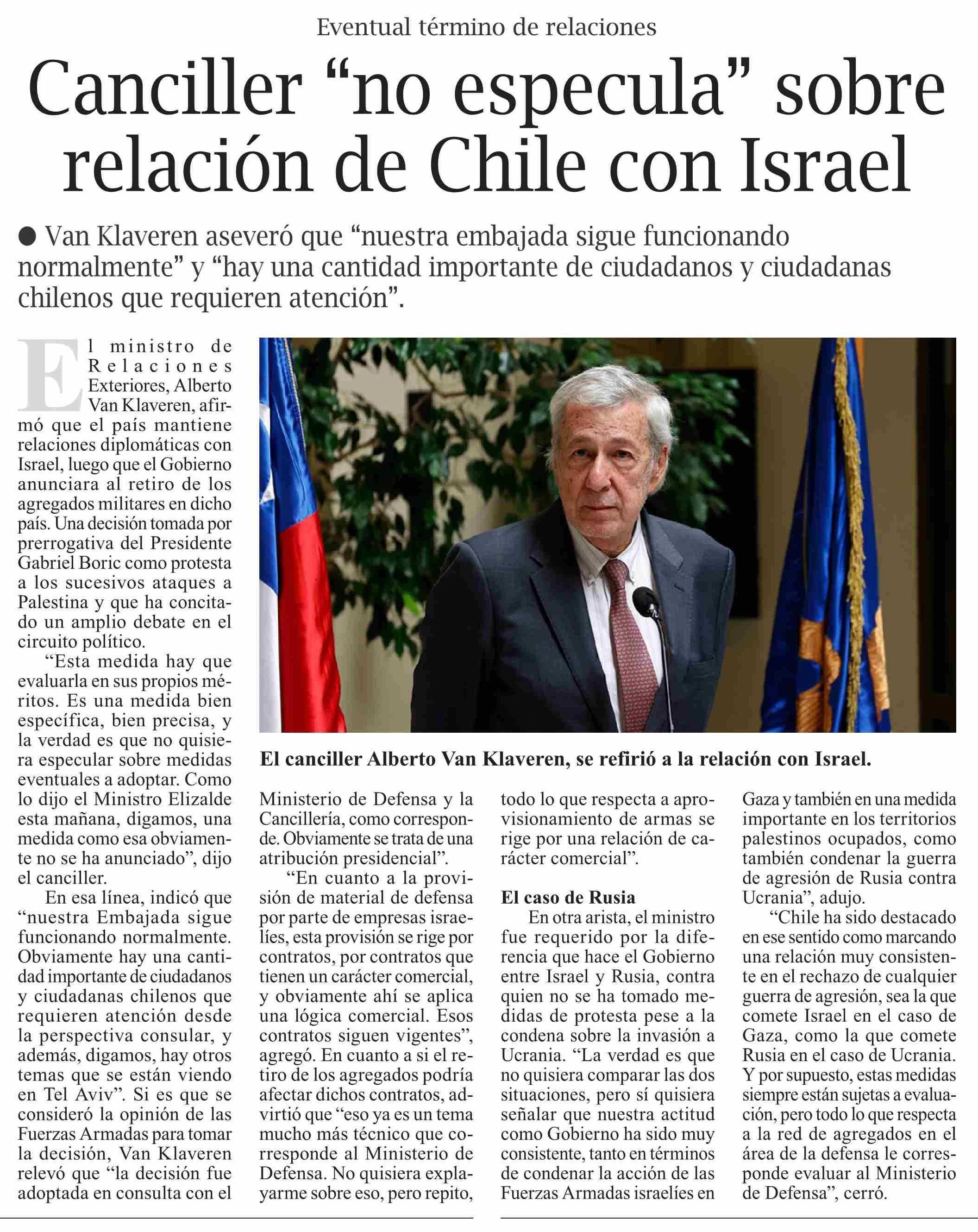 | Título: | Canciller “no especula” sobre relación de Chile con Israel |