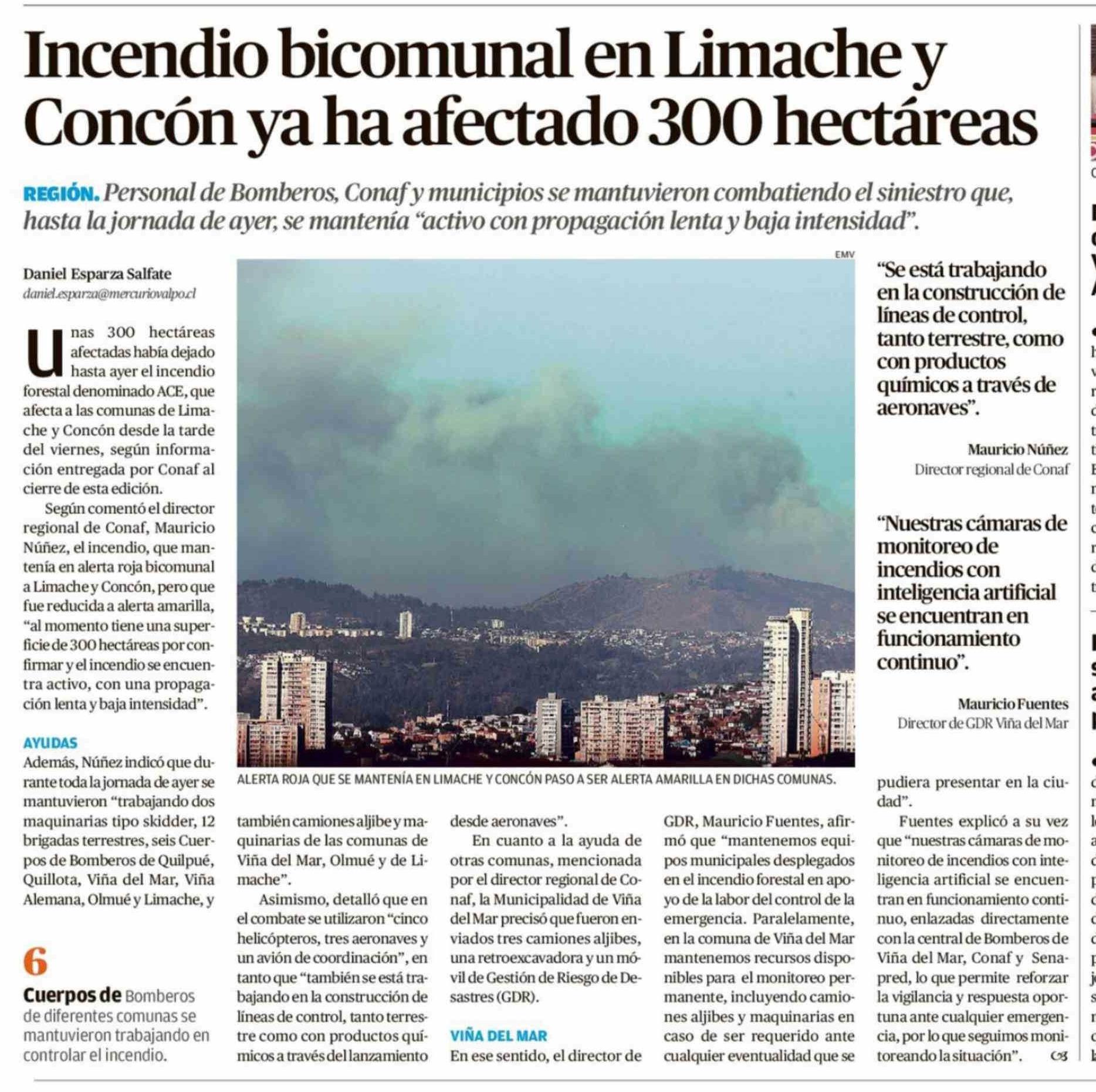 Incendio bicomunal en Limache y Concón ya ha afectado 300 hectáreas 15-02-2026 El Mercurio de Valparaíso |