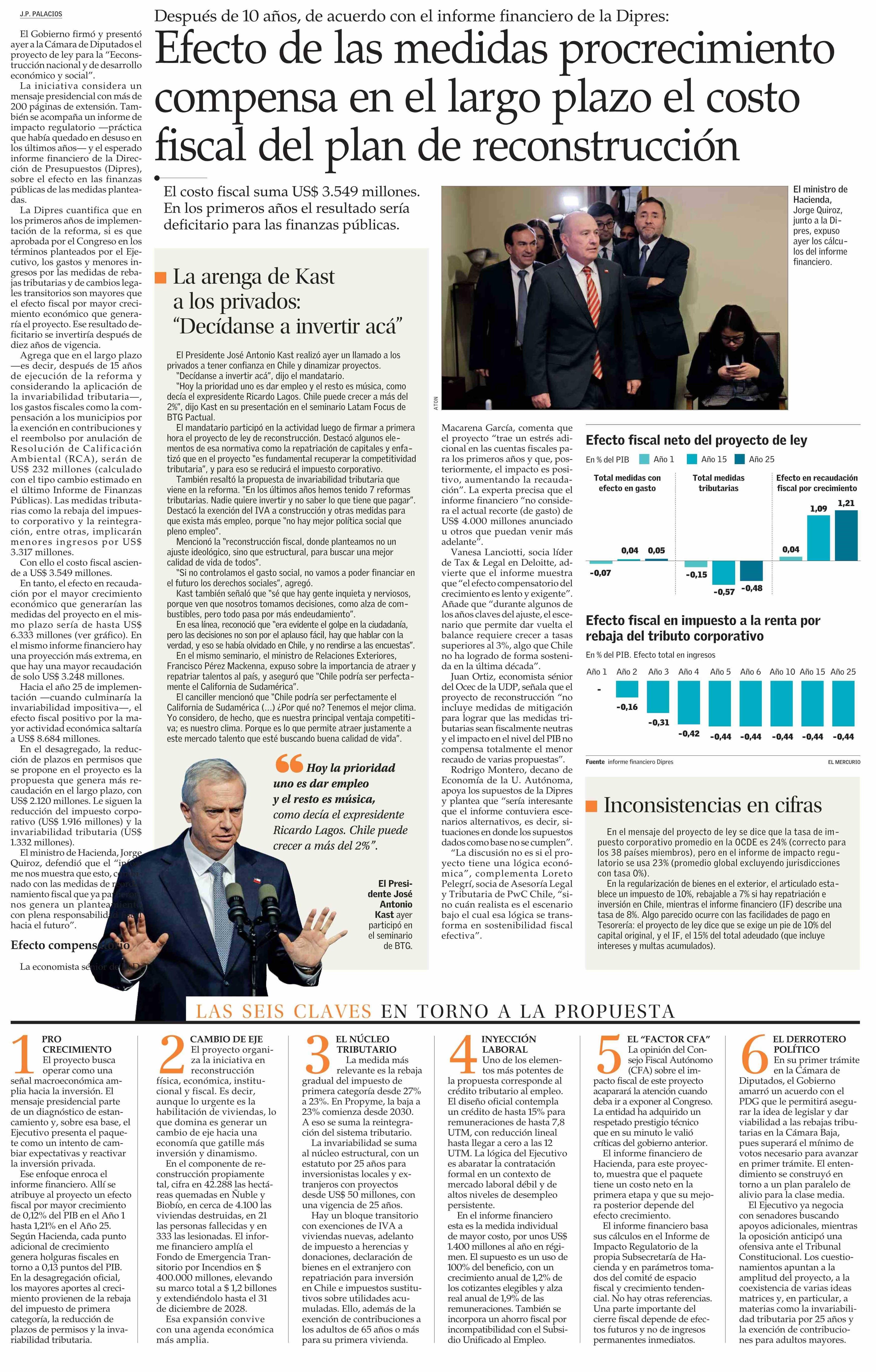 Efecto de las medidas procrecimiento compensa en el largo plazo el costo fiscal del plan de reconstrucción 23-04-2026 El Mercurio |