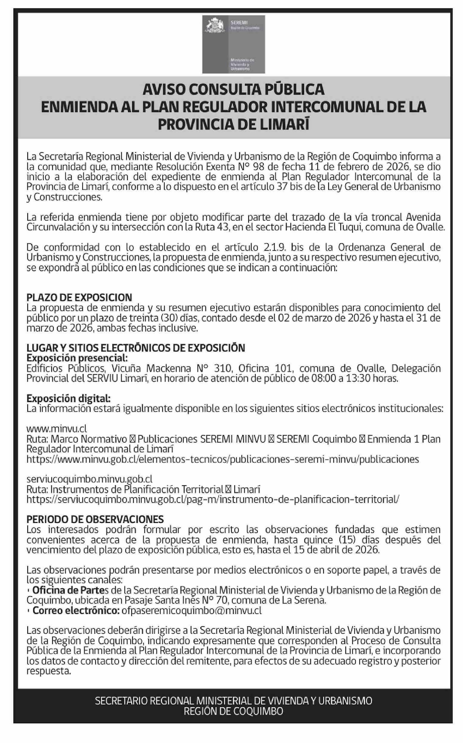 Extractos: AVISO CONSULTA PUBLICA ENMIENDA AL PLAN REGULADOR INTERCOMUNAL DE LA PROVINCIA DE LIMARI 27-02-2026 El Día |
