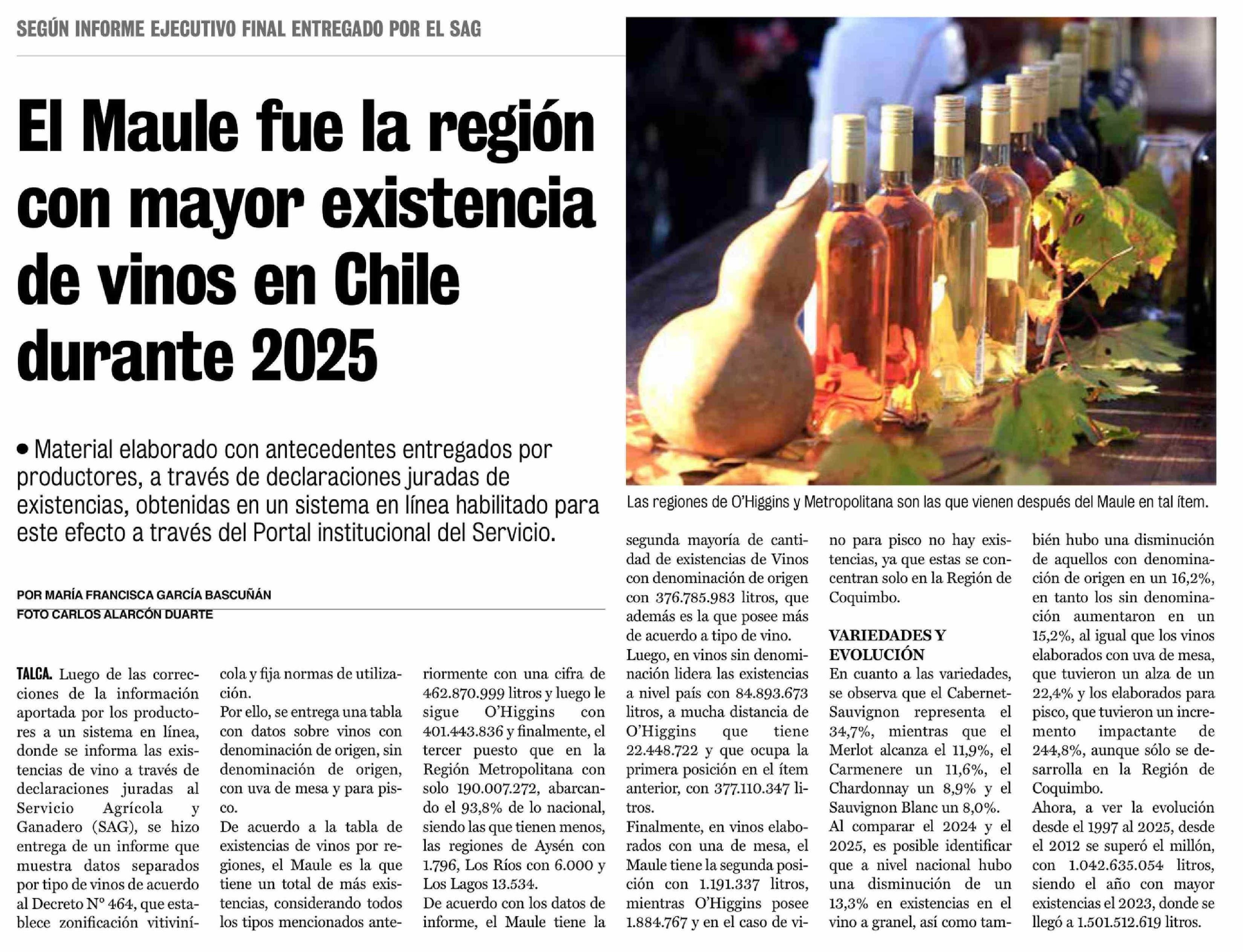 El Maule fue la región con mayor existencia de vinos en Chile durante 2025 13-03-2026 La Prensa de Curicó |
