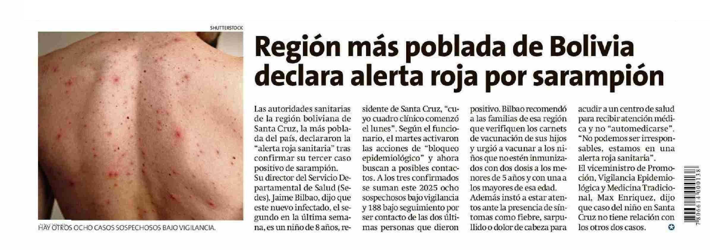| Título: | Región más poblada de Bolivia declara alerta roja por sarampión |
