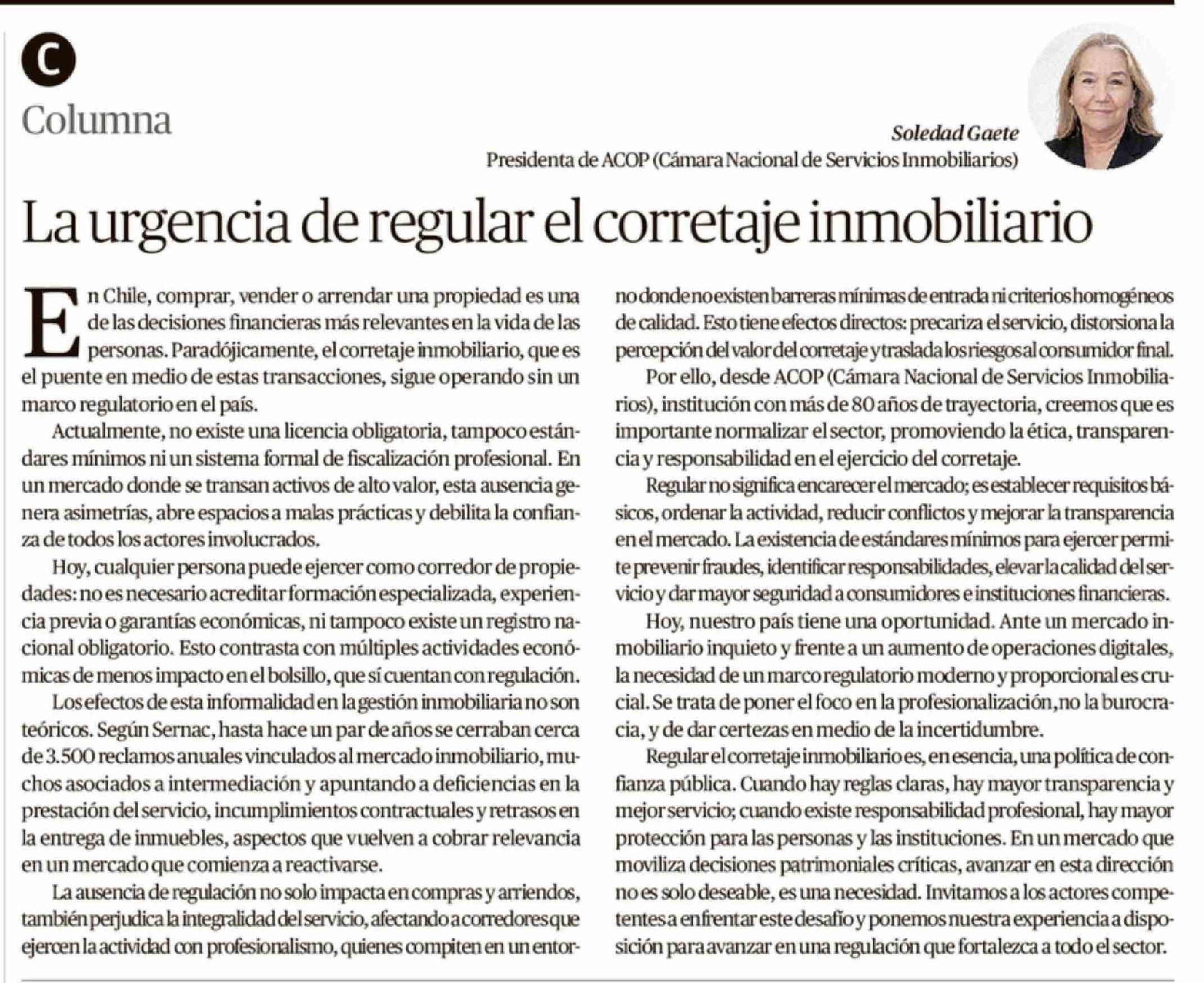 Columnas de Opinión: La urgencia de regular el corretaje inmobiliario 06-03-2026 El Mercurio de Valparaíso |