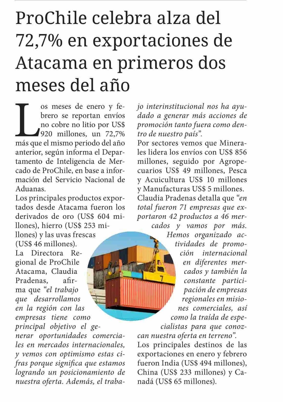 | Título: | ProChile celebra alza del 72,7% en exportaciones de Atacama en primeros dos meses del año |