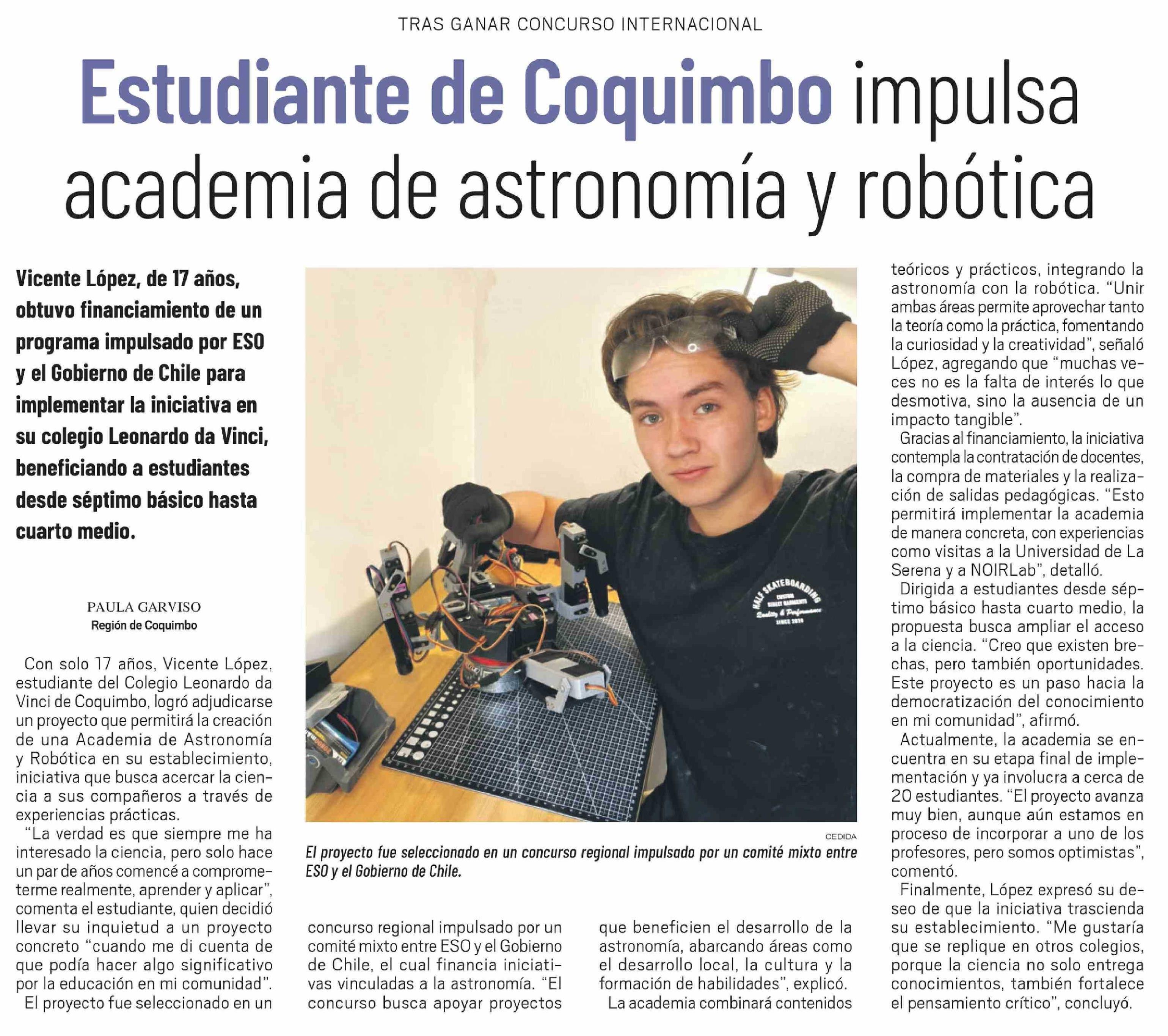 Estudiante de Coquimbo impulsa academia de astronomía y robótica 24-04-2026 El Ovallino |
