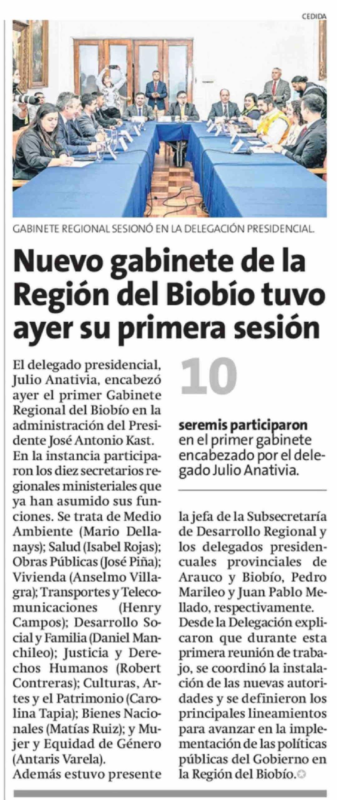 Nuevo gabinete de la Región del Biobio tuvo ayer su primera sesión 31-03-2026 La Estrella de Concepción |