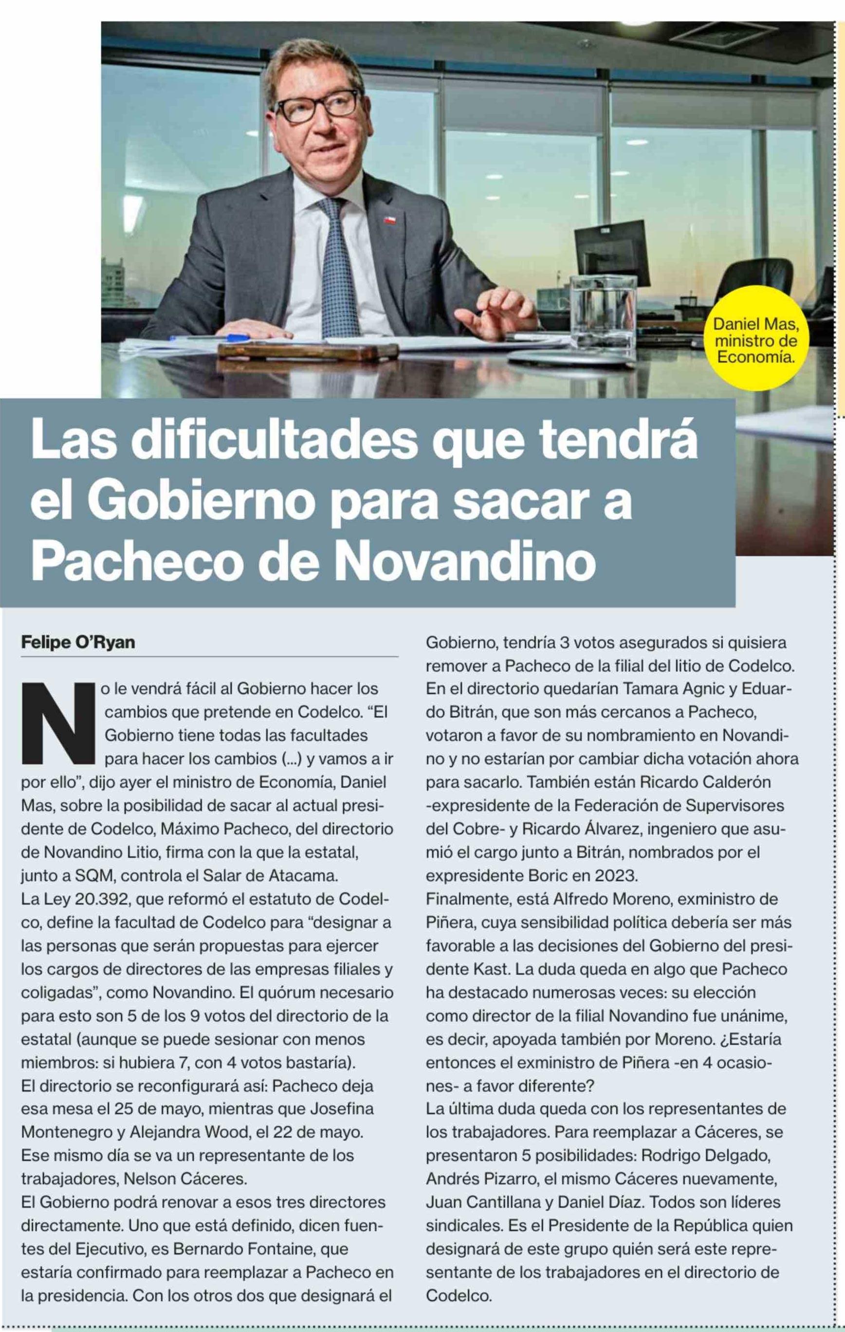 Las dificultades que tendrá el Gobierno para sacar a Pacheco de Novandino 14-04-2026 La Segunda |