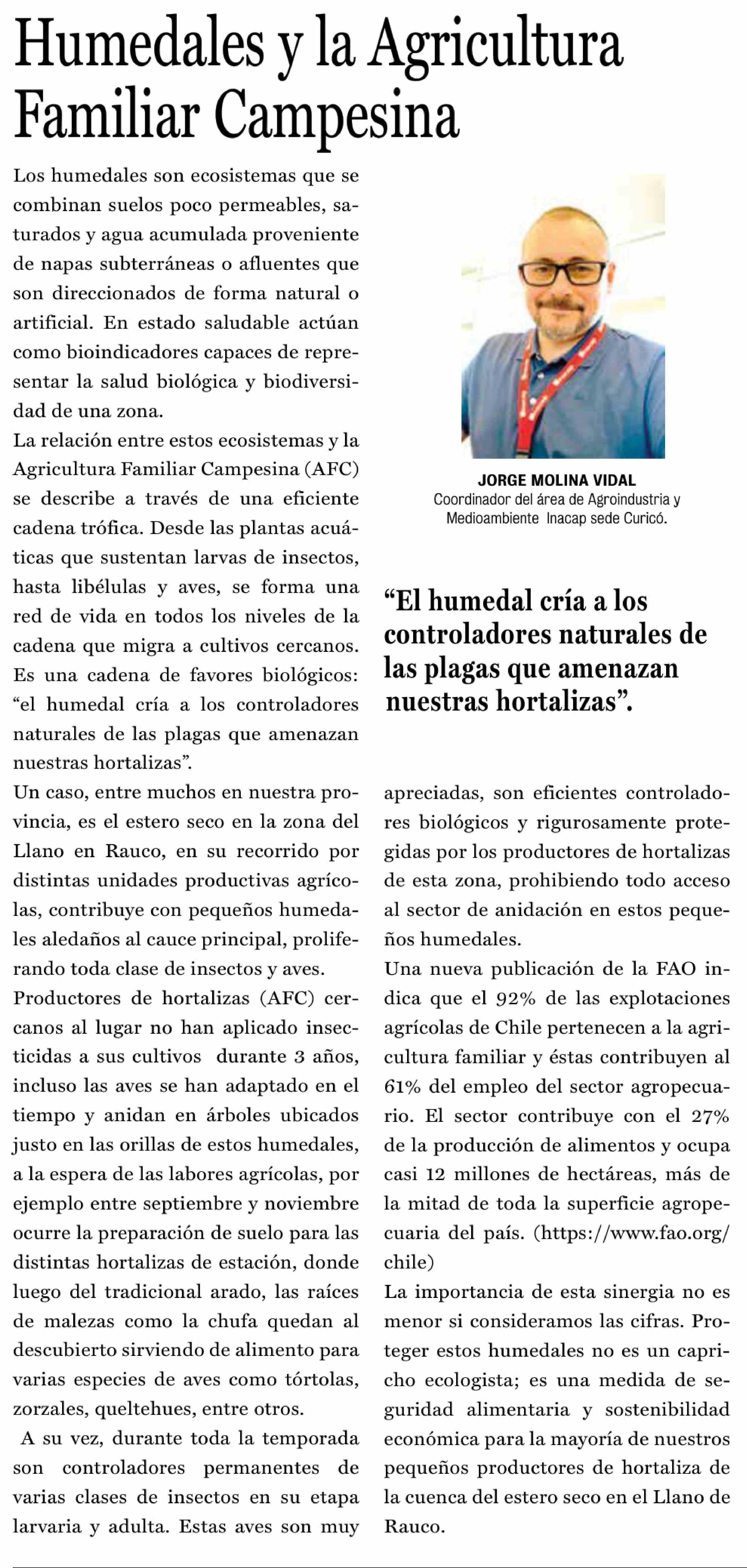 Columnas de Opinión: Humedales y la Agricultura Familiar Campesina 02-02-2026 La Prensa de Curicó |