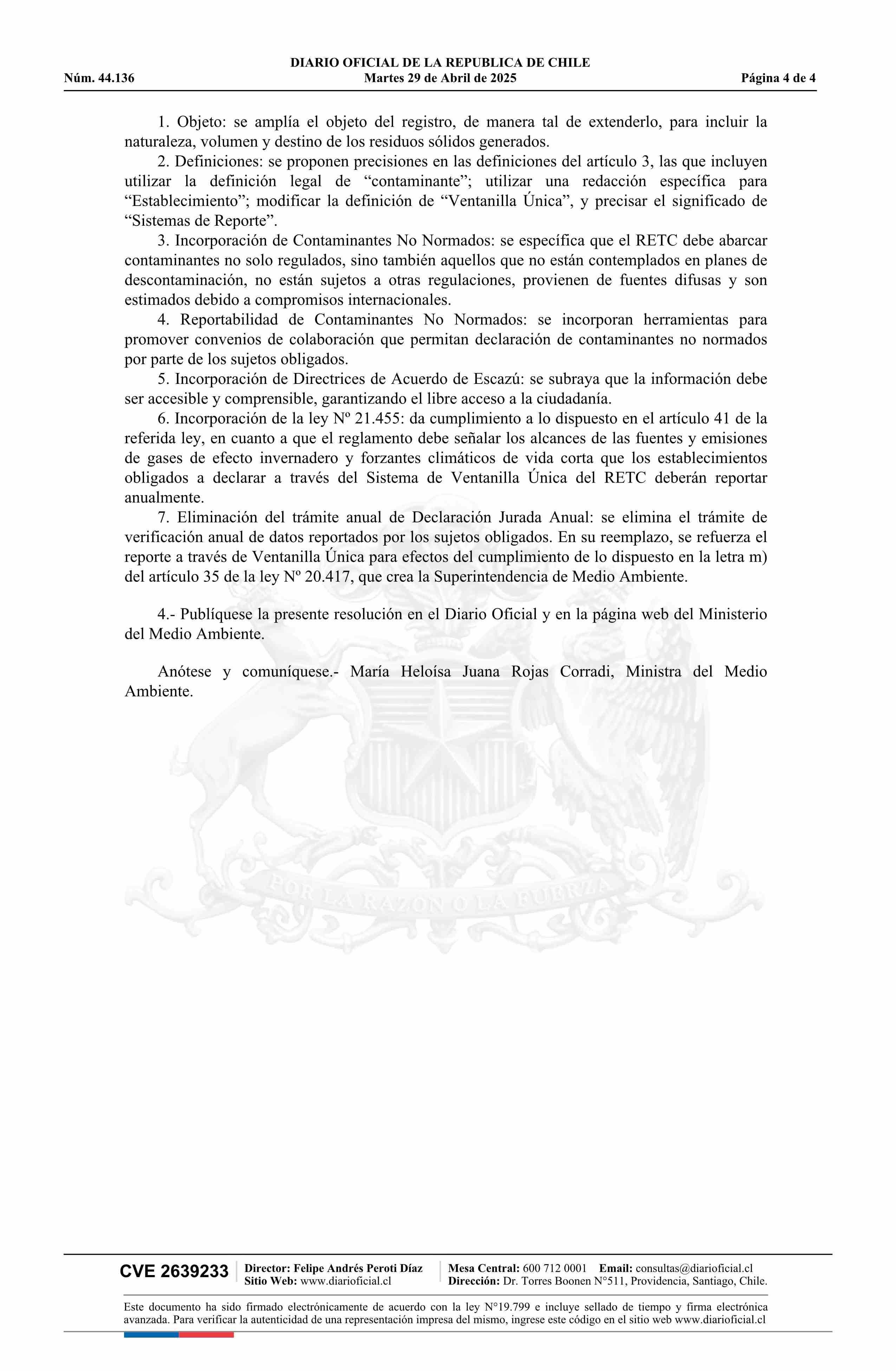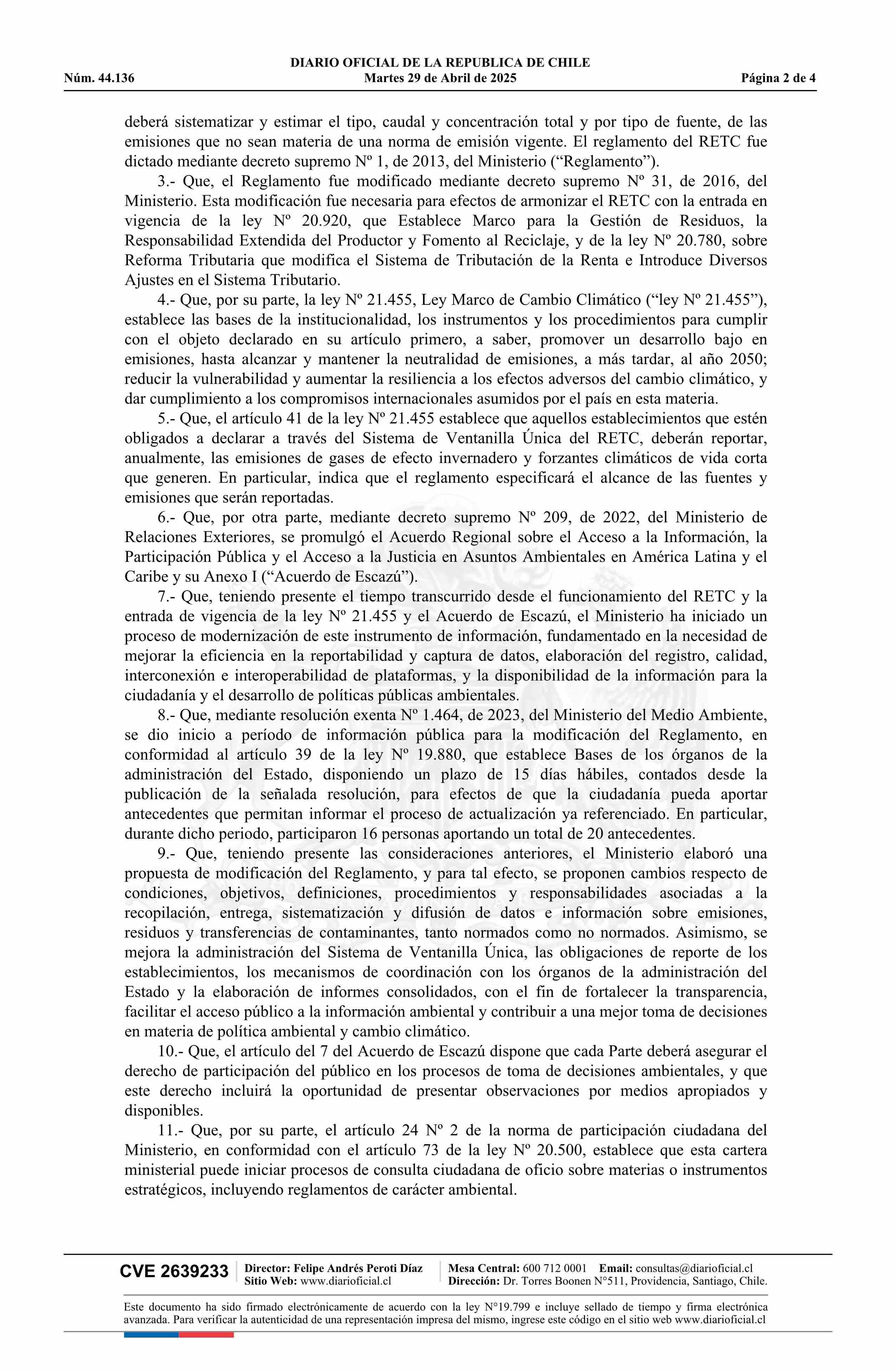 | Título: | Resolución exenta número 2.359, de 2025.- Aprueba anteproyecto de modificación del decreto Nº 1, de 2013, que aprueba Reglamento del Registro de Emisiones y Transferencias de Contaminantes, y lo somete a consulta ciudadana |