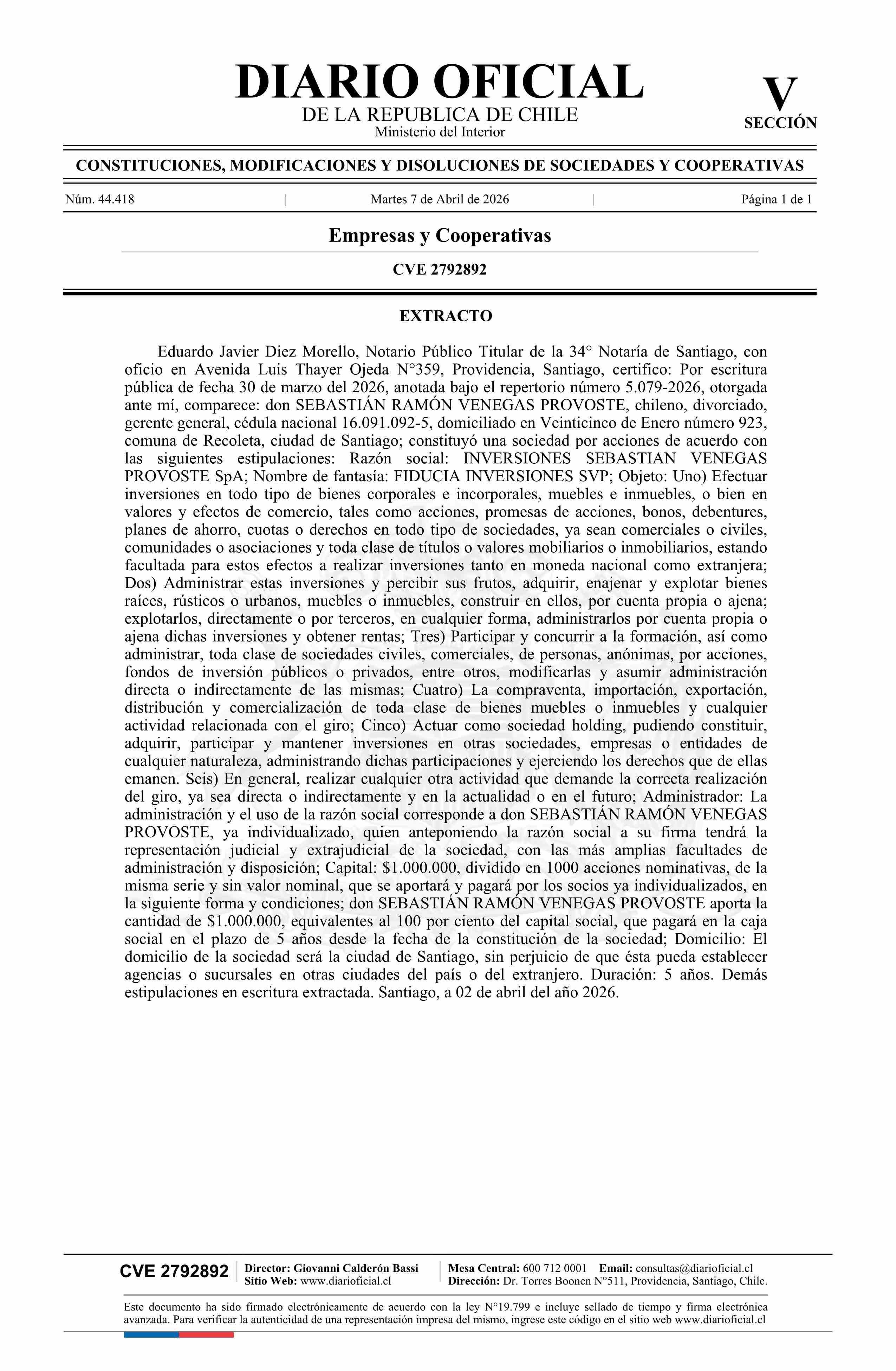 INVERSIONES SEBASTIAN VENEGAS PROVOSTE SpA 07-04-2026 Diario Oficial Edición Electrónica |