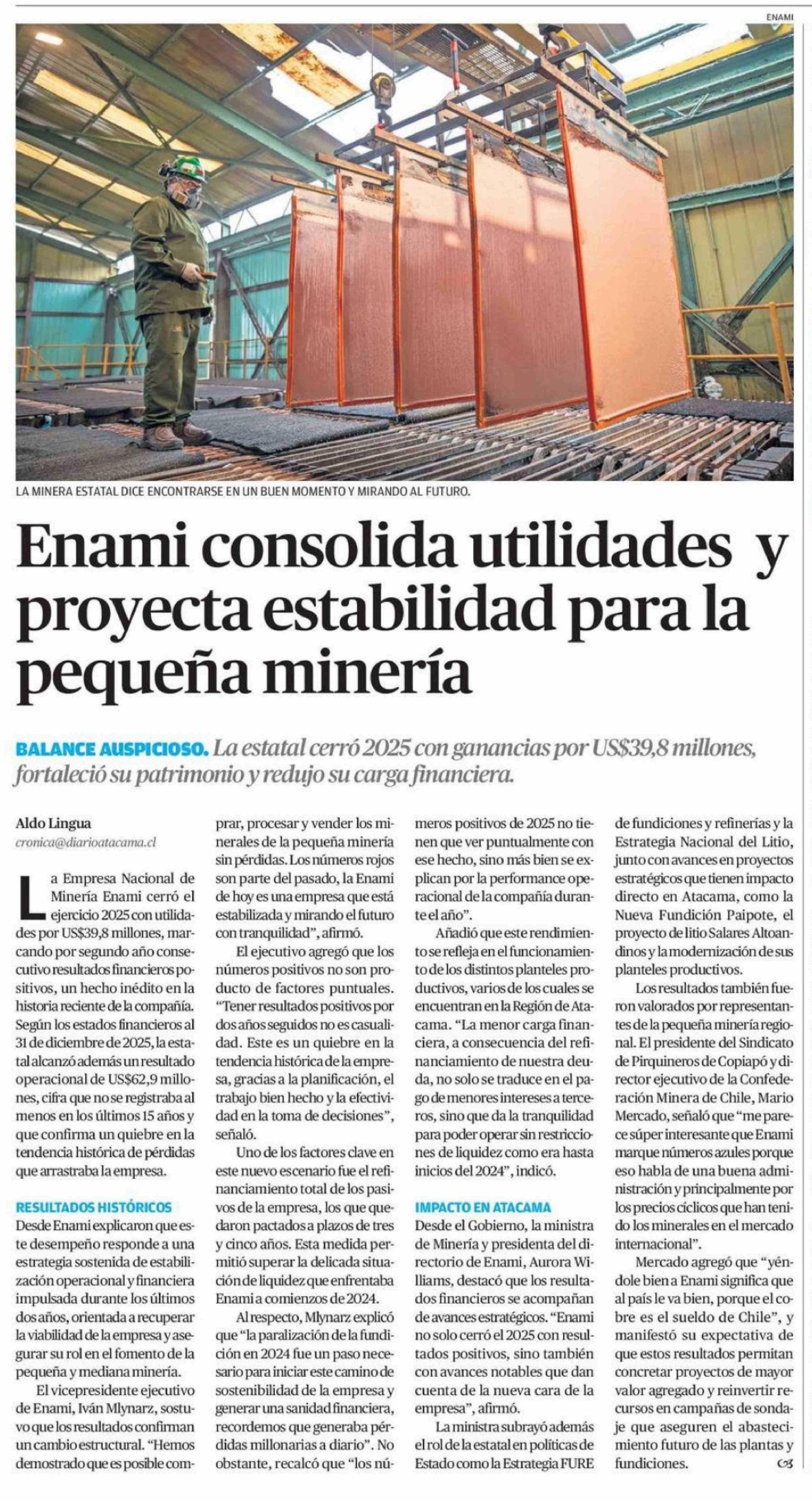 Enami consolida utilidades y proyecta estabilidad para la pequeña minería 03-02-2026 El Diario de Atacama |