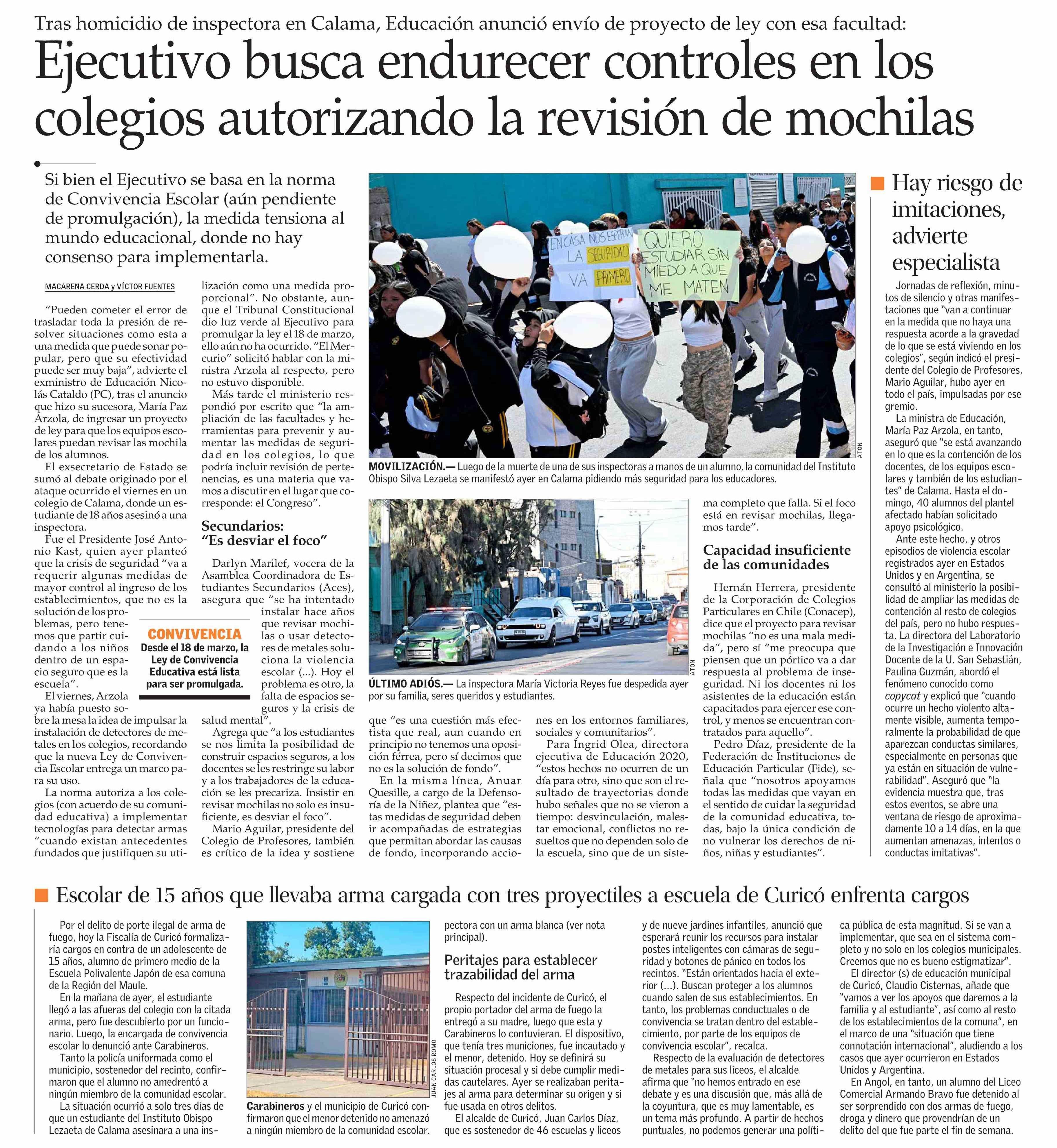 Ejecutivo busca endurecer controles en los colegios autorizando la revisión de mochilas 31-03-2026 El Mercurio |