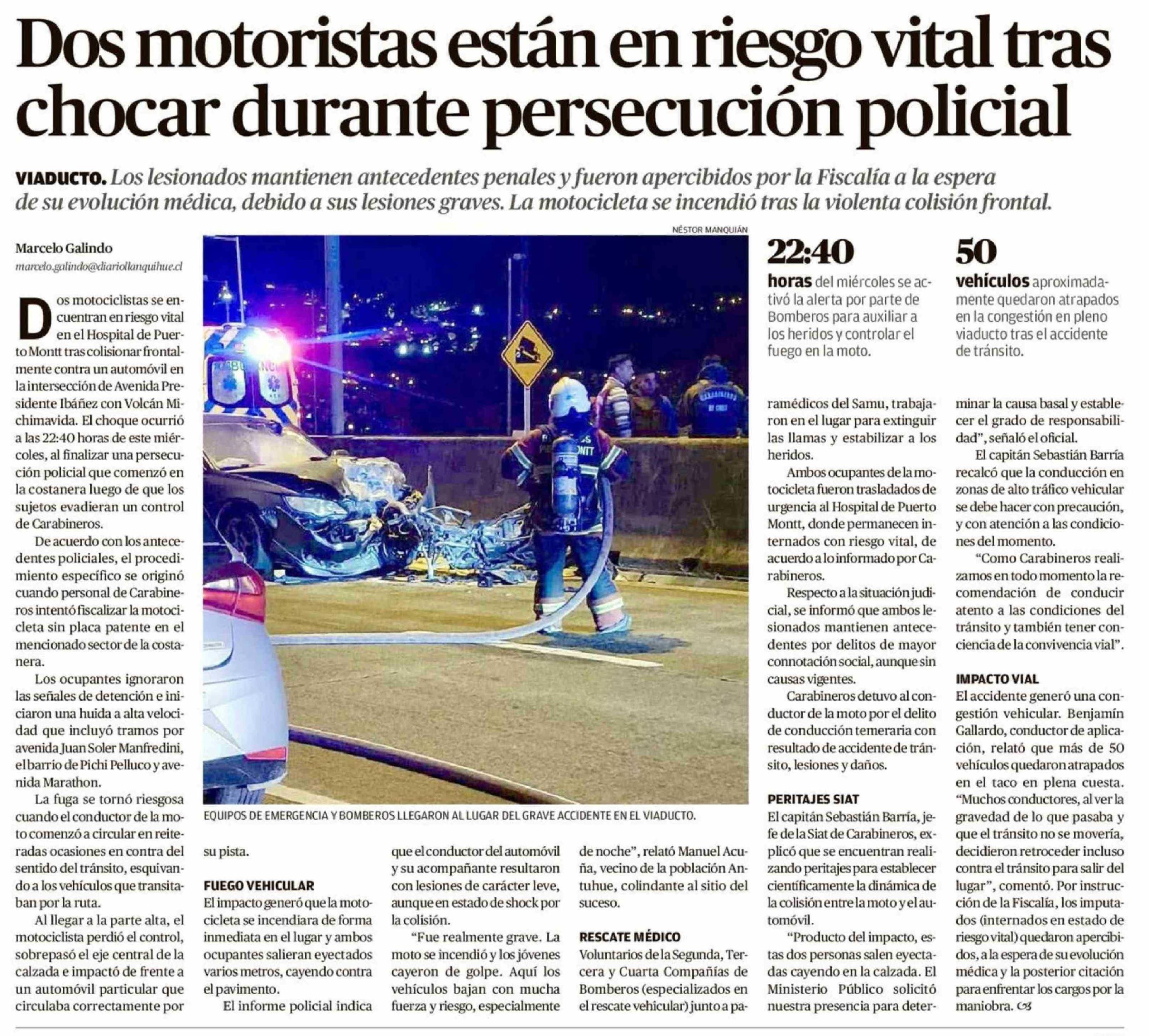 Dos motoristas están en riesgo vital tras chocar durante persecución policial 17-04-2026 El Llanquihue |