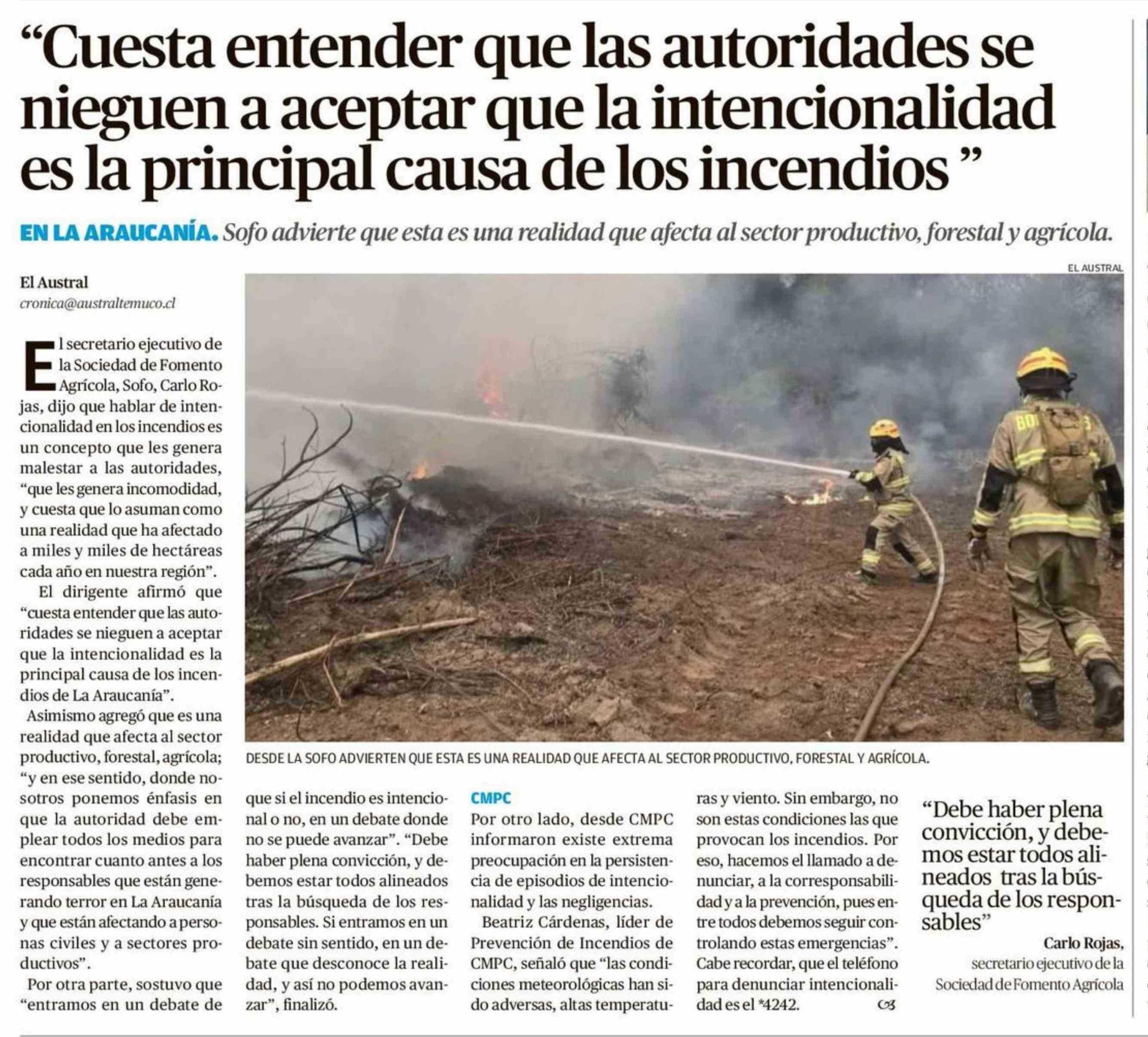 "Cuesta entender que las autoridades se nieguen a aceptar que la intencionalidad es la principal causa de los incendios" 24-01-2026 El Austral de la Araucanía |