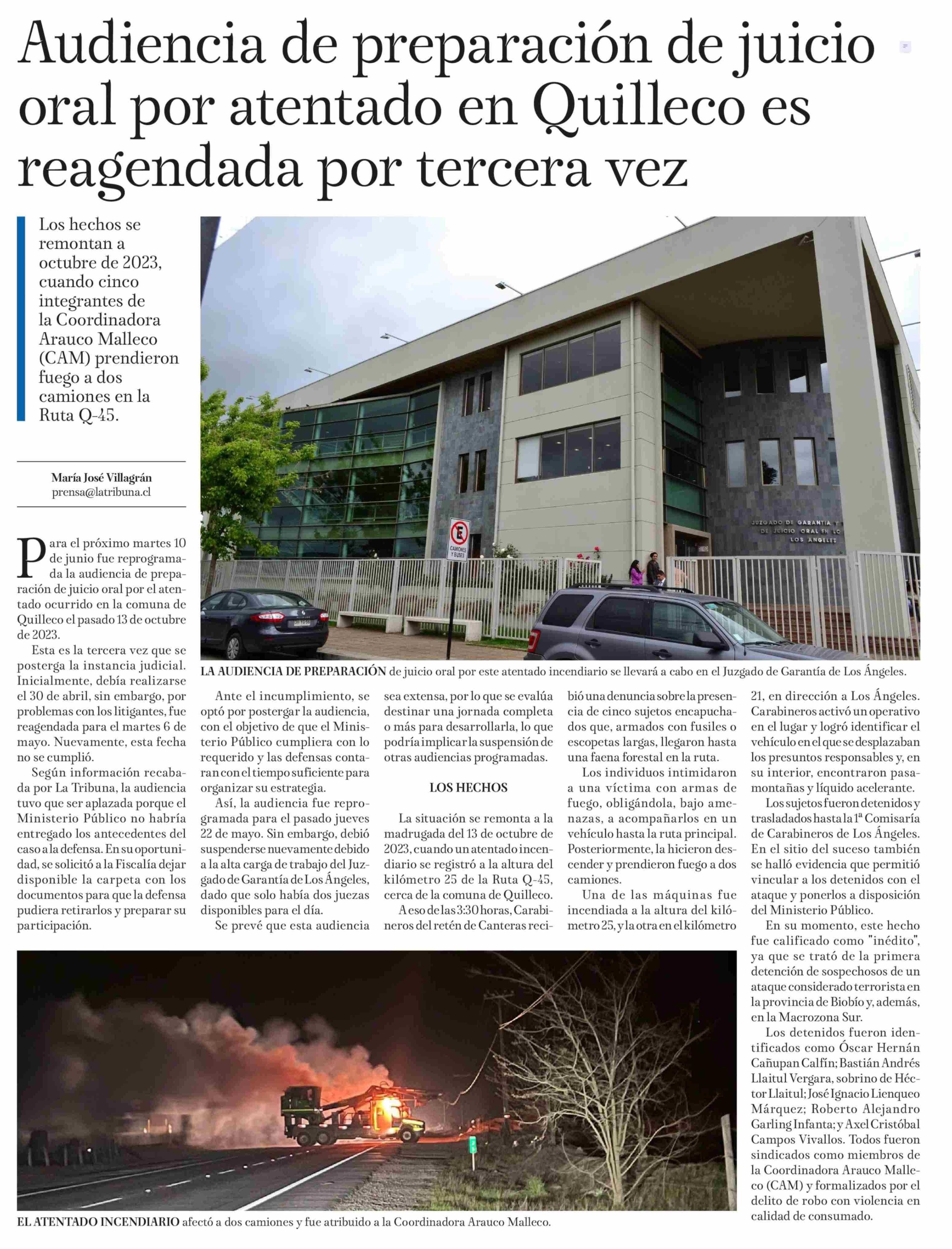 Título: Audiencia de preparación de juicio oral por atentado en Quilleco es reagendada por tercera vez
