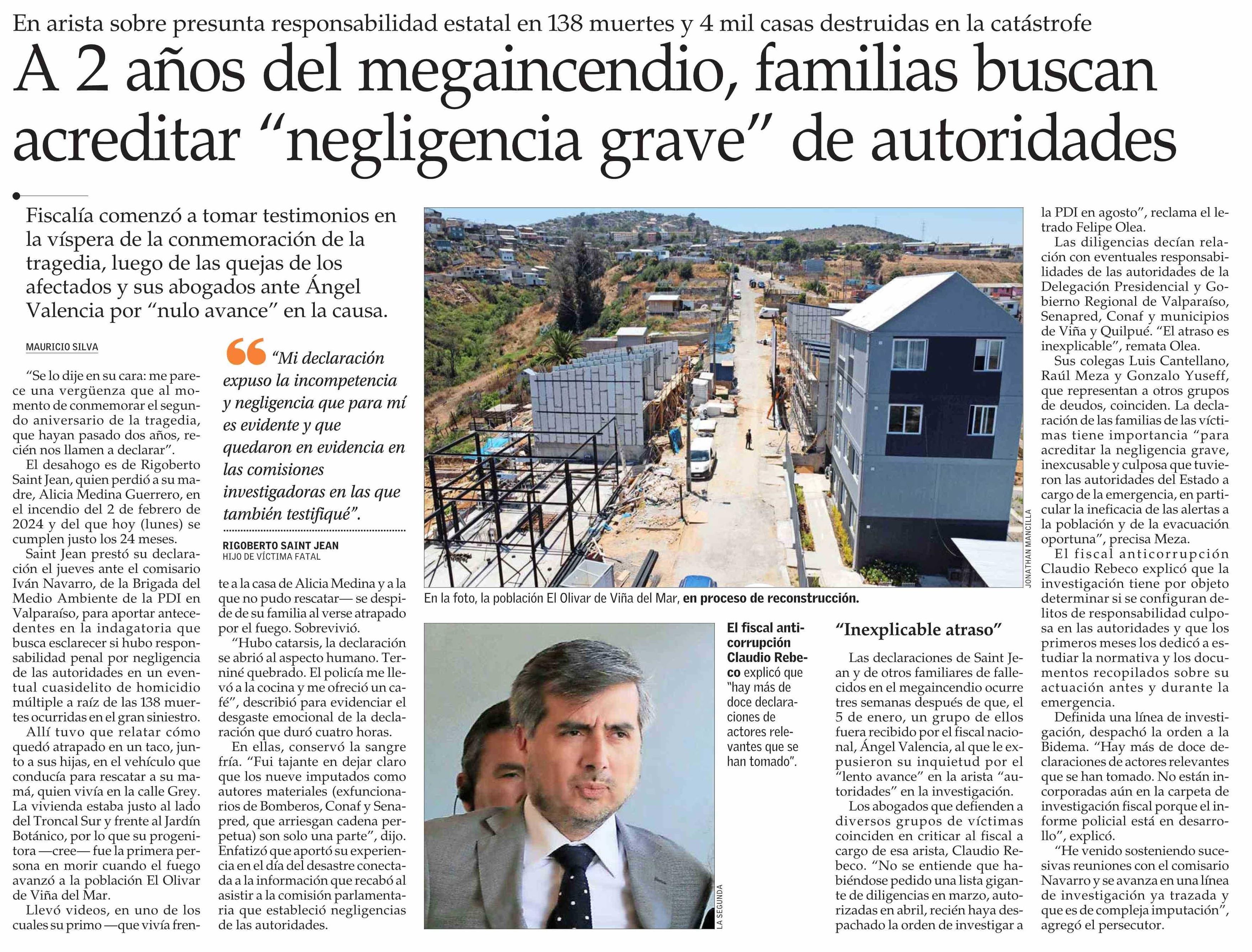 A 2 años del megaincendio, familias buscan acreditar “negligencia grave” de autoridades 02-02-2026 El Mercurio |